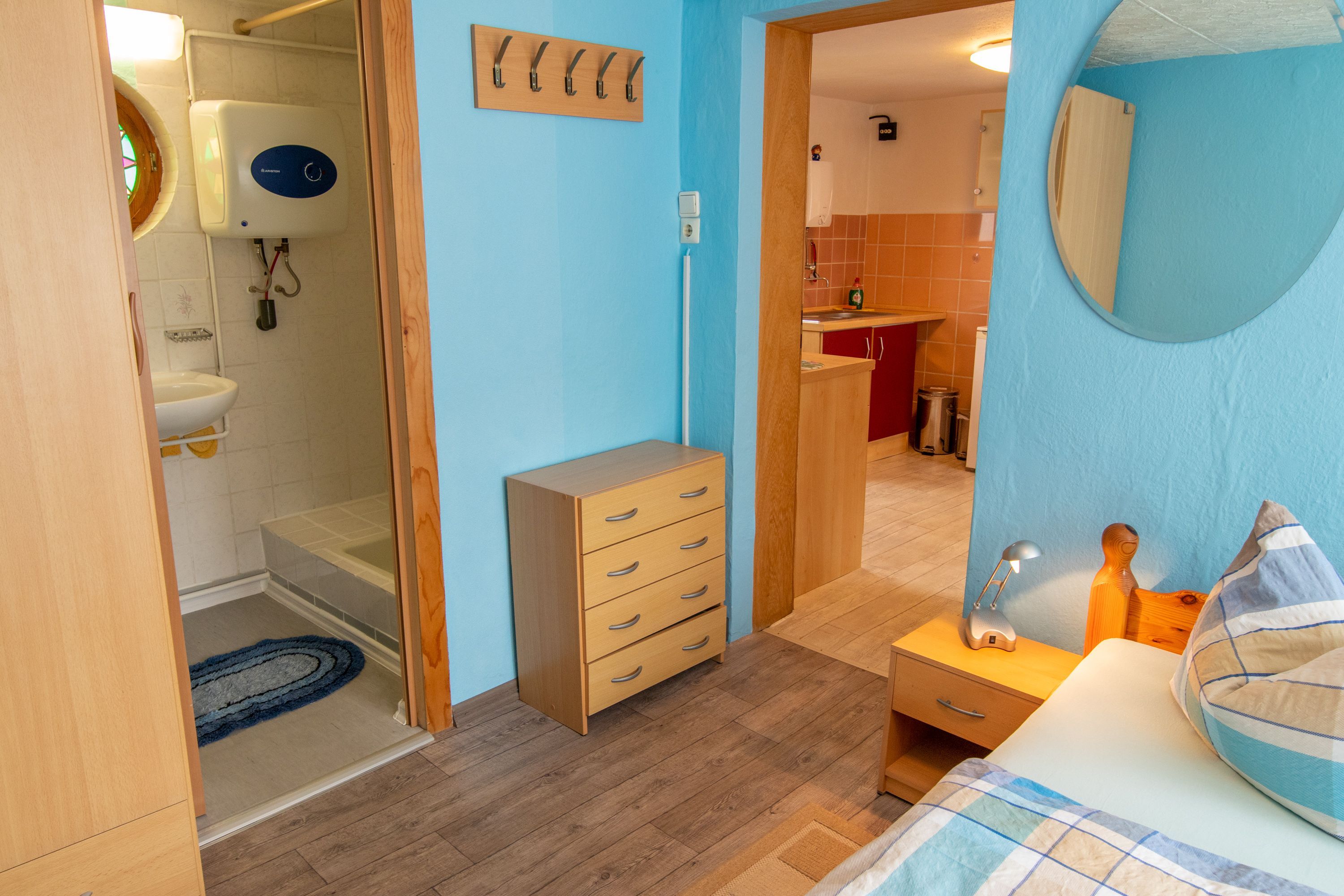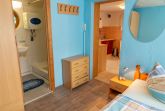Das Schlafzimmer dient als Durchgangszimmer zum Bad.