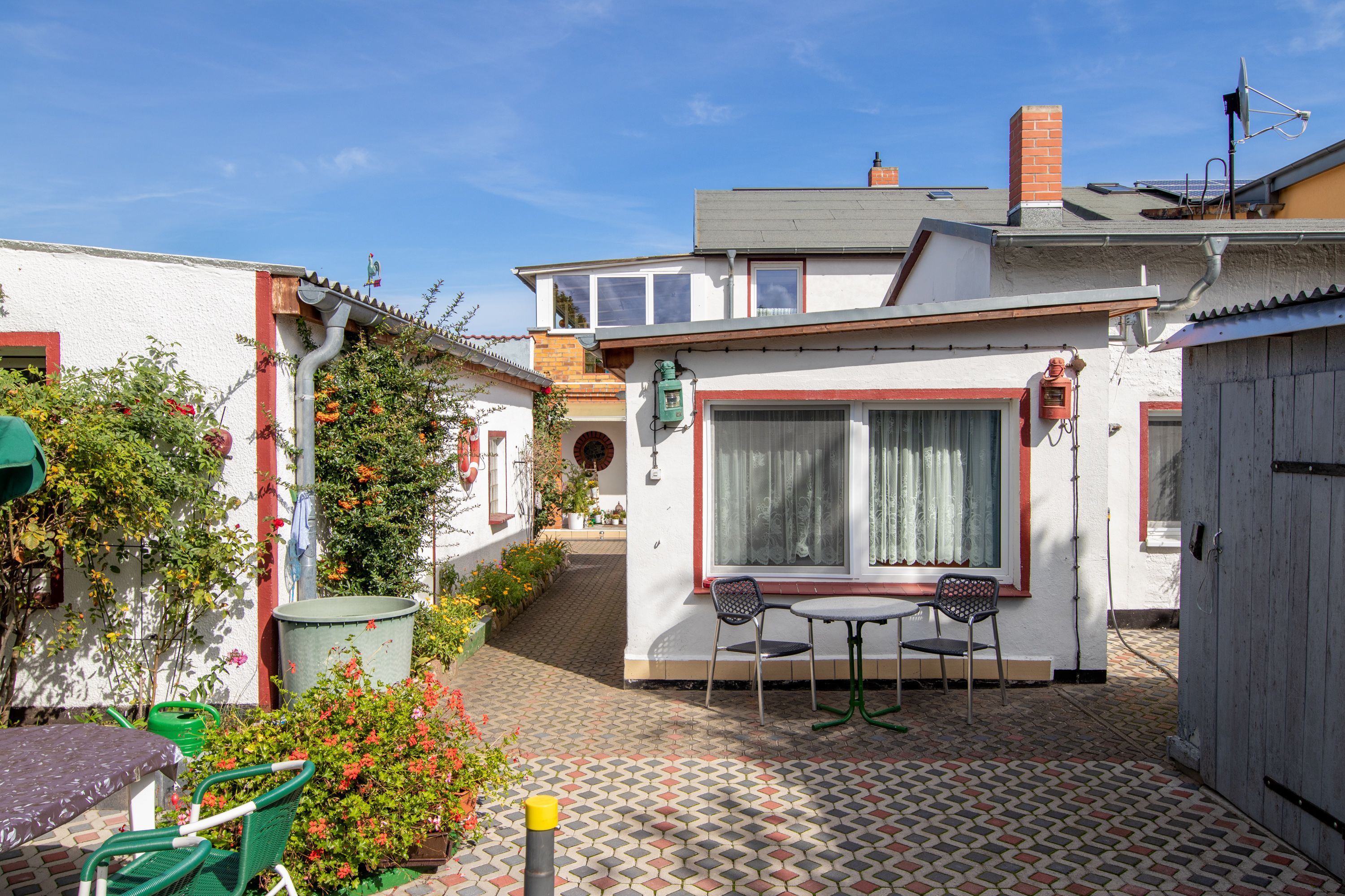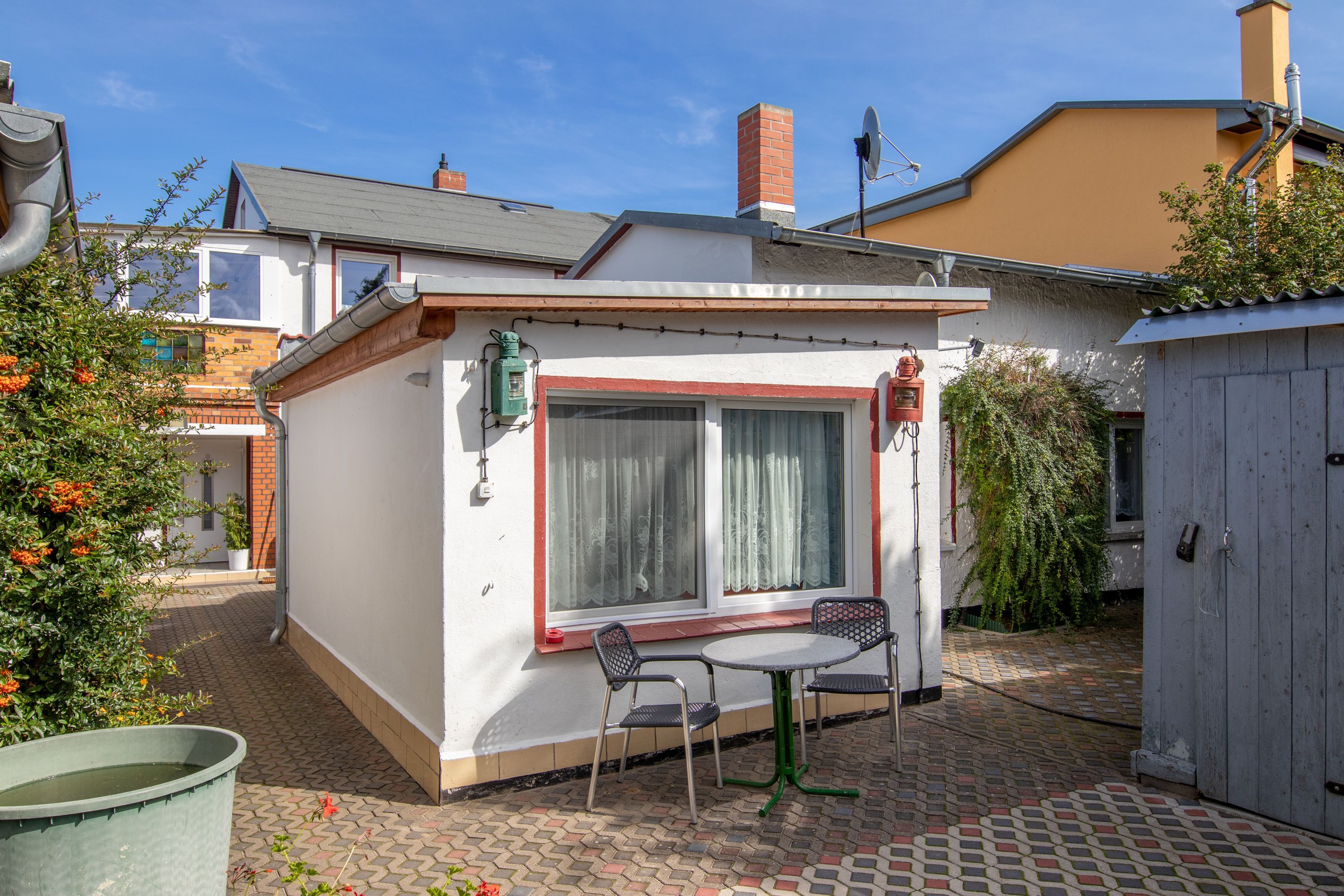 Hinter dem Haus steht den Gästen eine ruhige Terrasse mit Gartenmöbeln zur Verfügung.