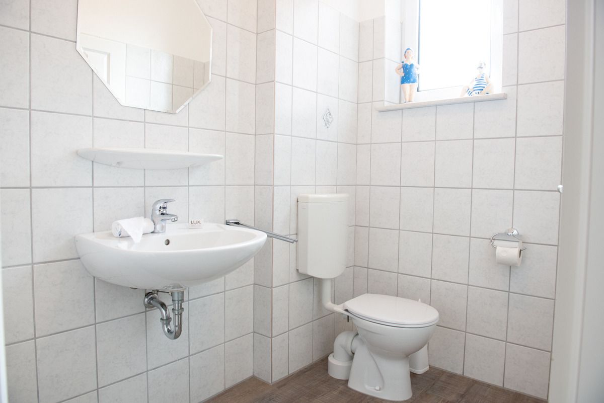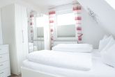 Auf der 2. Etage befinden sich die beiden Schlafzimmer mit je einem Doppelbett, in einem Schlafzimmer befindet sich ein Fernseher an der Wand.. Ebenfalls oben ist das große Badezimmer mit WC und Fenster.