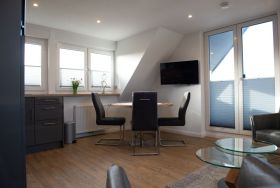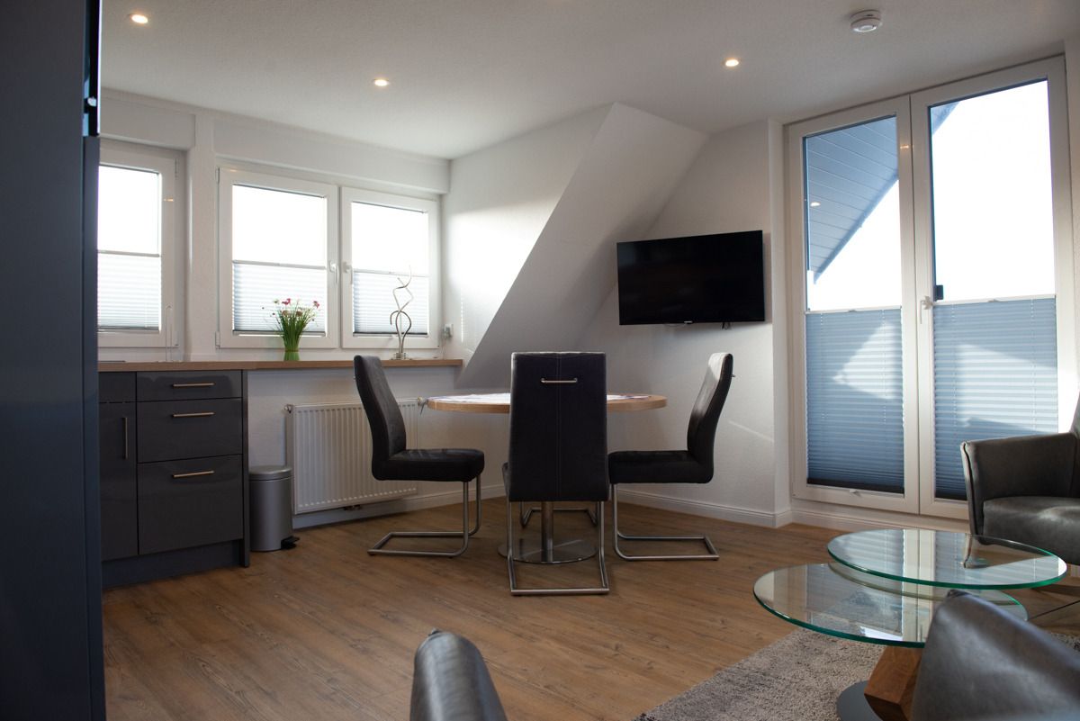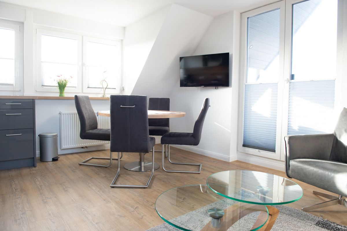 Im Wohnzimmerbereich stehen Ihnen insgesamt eine Essgruppe, eine Couch mit 2 Sessel inklusive Tisch zur Verfügung. Ein moderner Flatscreen Sat-TV rundet Ihr Entertainment ab. Vom Wohnzimmer / Küchenbereich gelangen Sie auf Ihren Balkon mit Deichblick. Das Panoramafenster ist selbstverständlich -wie alle Fenster- mit Plissees ausgestattet.
