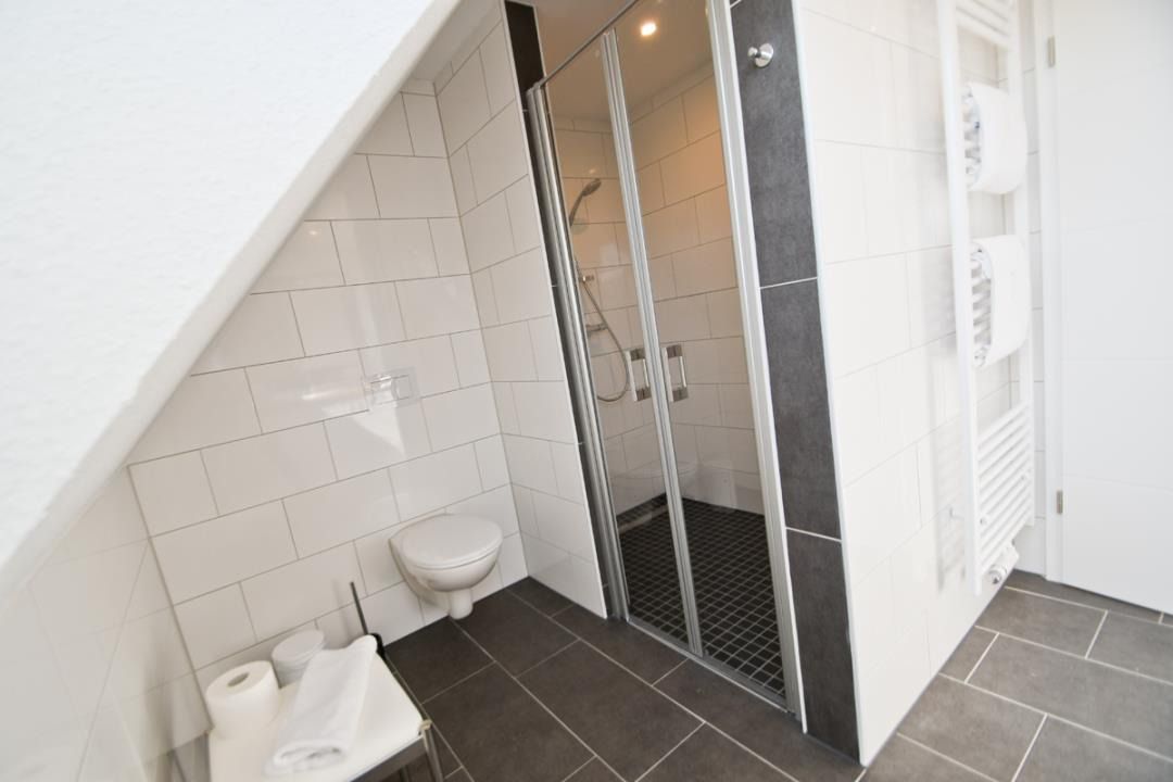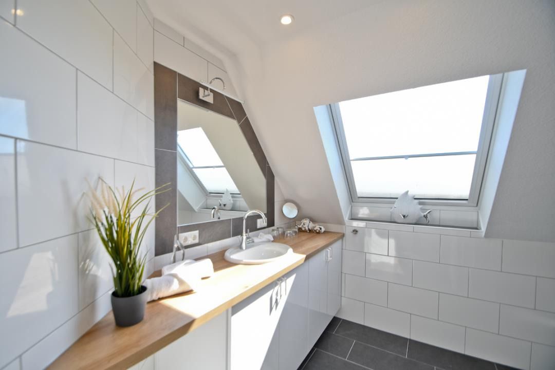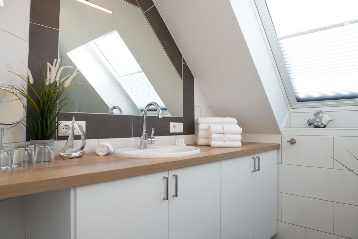 Ihr modernes Badezimmer verfügt über eine bodenebene Dusche , ein Hänge-WC und eine Waschtischkombination mit großem Spiegel. Ein Fön ist selbstverständlich. Das Fenster ist mit einem Plissee ausgestattet. Sie haben die Möglichkeit, Hand- & Badetücher für jede angemeldete Person gegen Gebühr gleich mit zu buchen.