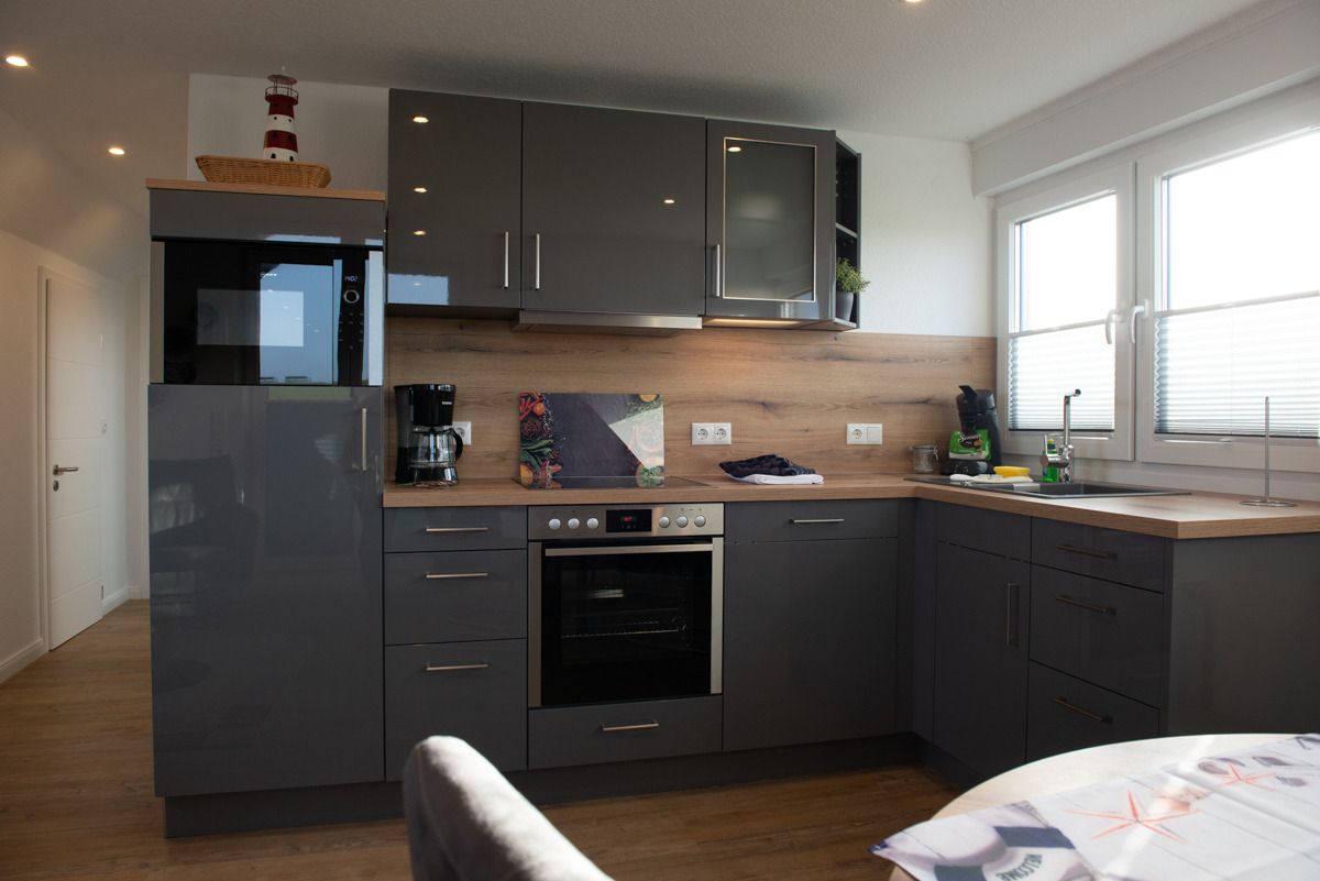 Ihre moderne Küchenzeile mit Backofen / Ceranfeld (inklusive Abzug), Spülmaschine, ein Kühlschrank mit Gefrierfach und die Mikrowelle läßt keine Wünsche offen. Eine Kaffee- & eine Senseo-Maschine, Toaster, Wasserkocher und andere erforderliche Küchengeräte sind selbstverständlich. Geschirr, Gläser, Becher, Bestecke und vieles mehr runden Ihre Küche ab. Ihre 4 Sitzgelegenheiten am Küchentisch laden zum gemütlichen Essen ein. Ihr Küchenfenster ist ebenfalls mit Plissees (teilweise auch Außenjalousien) ausgestattet.
