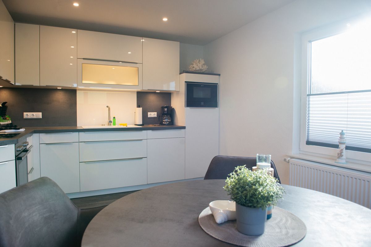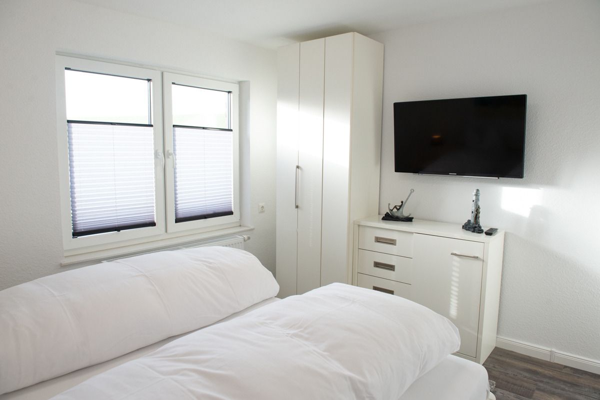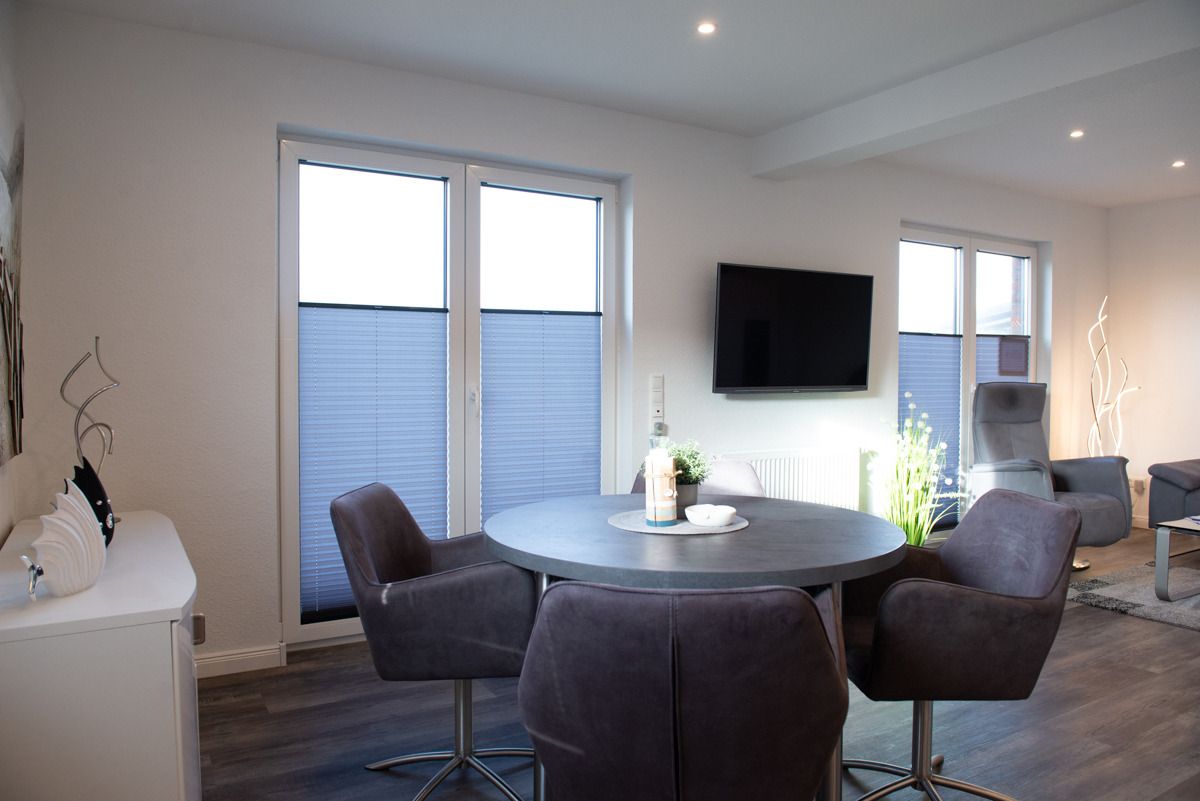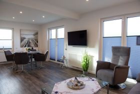 Die Ferienwohnung Deichhöhe VU für 2 Personen befindet sich im Erdgeschoß eines neu erbauten Ferienhauses mit insges. 4 Wohnungen. Die Wohnung liegt in einer TOP Lage, mit einem direkten Blick zum Deich. Das Wohn/Esszimmer ist mit einer gemütlichen Couch, einem Relaxsessel, einer Essgruppe und einer Einbauküche cpl. eingerichtet - von dort aus gelangen Sie auf die möblierte Terrasse. Das Schlafzimmer ist mit einem Doppelbett, Fernseher und Verdunklungsplissees ausgestattet. Das moderne Bad mit Fenster verfügt über eine bodenebene Dusche, WC, Waschtischkombination mit großem Spiegel, Föhn und Hocker. Es ist alles ebenerdig eingerichtet - allerdings für Rollstuhlfahrer leider nicht geeignet. Ein PKW Einstellplatz ist direkt am Haus - ebenso eine Fahrradgarage mit Stromanschluß.