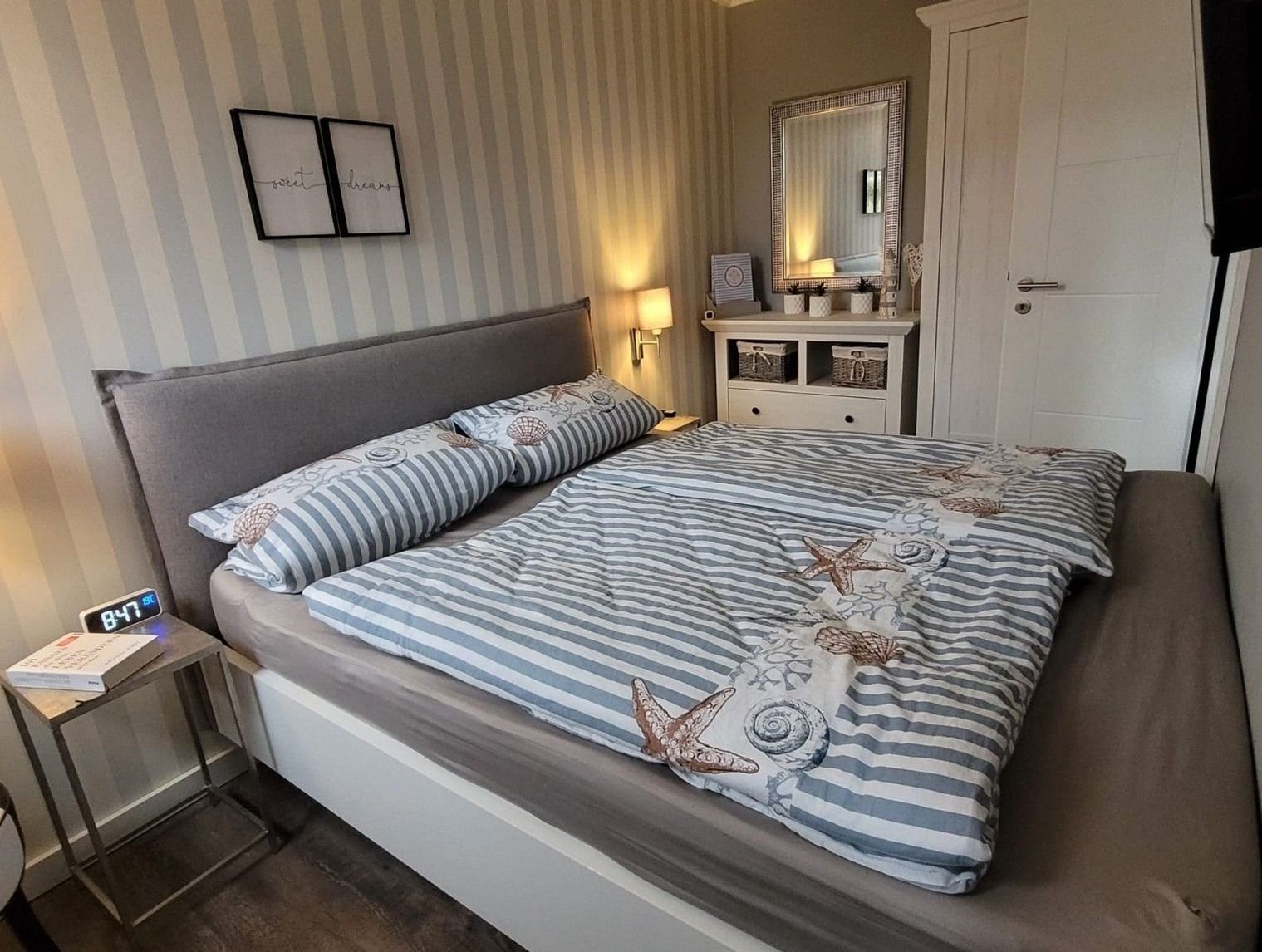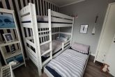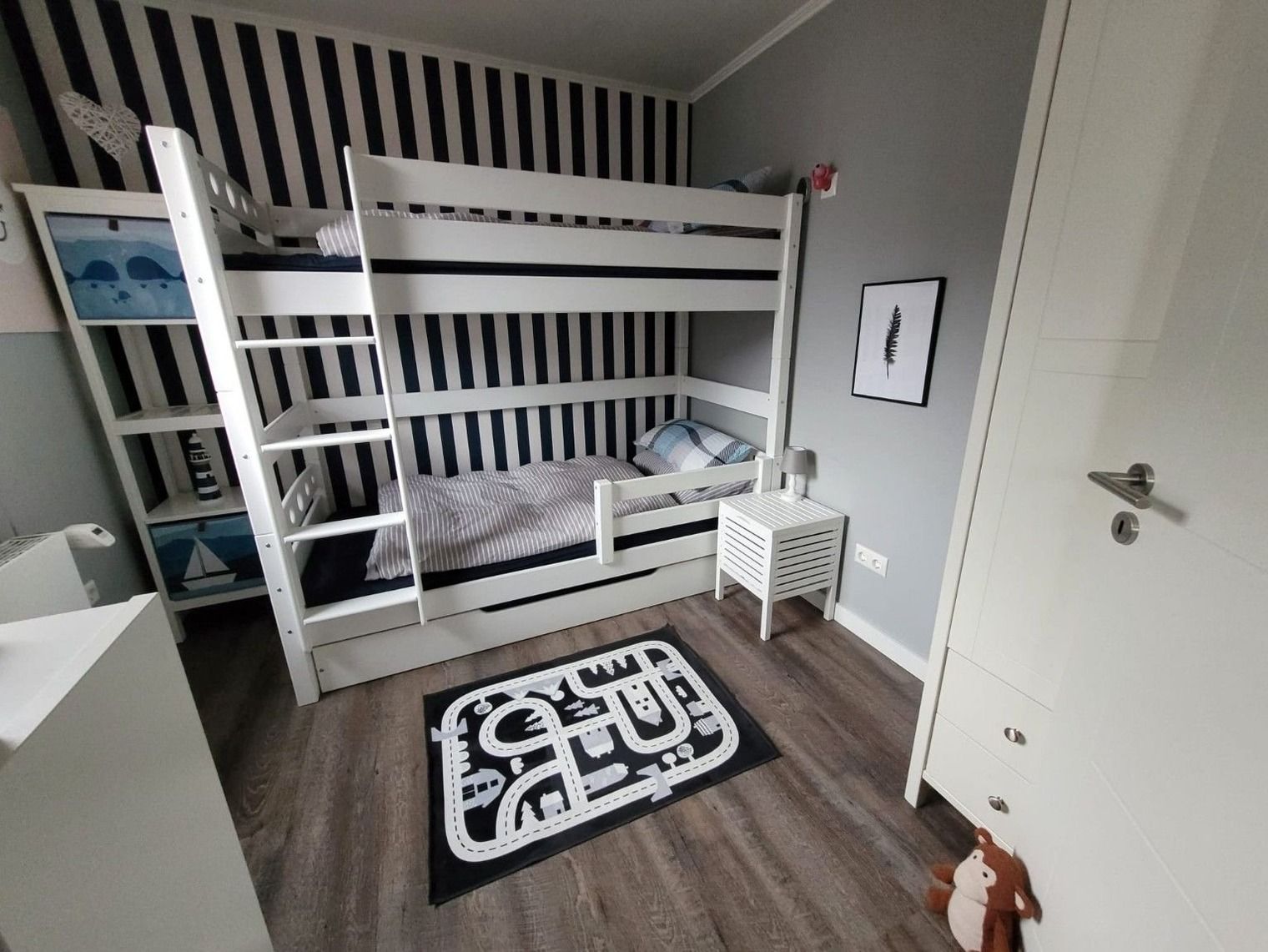 Das Schlafzimmer mit Doppelbett sorgt für erholsame Nächte, während das liebevoll gestaltete Kinderzimmer mit Etagenbett und zusätzlichem Einzelbett besonders bei den kleinen Gästen beliebt ist.
