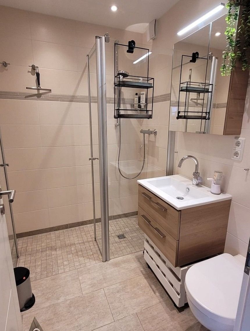 Das moderne Badezimmer verfügt über eine ebenerdige Dusche, Handtuchheizung und stilvolle Details.