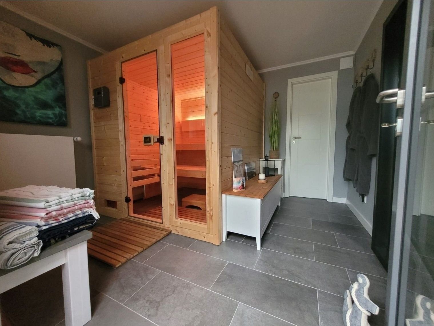 Ein Highlight des Hauses ist der eigene Wellnessbereich mit Sauna ideal, um auch an kühleren Tagen zu entspannen.