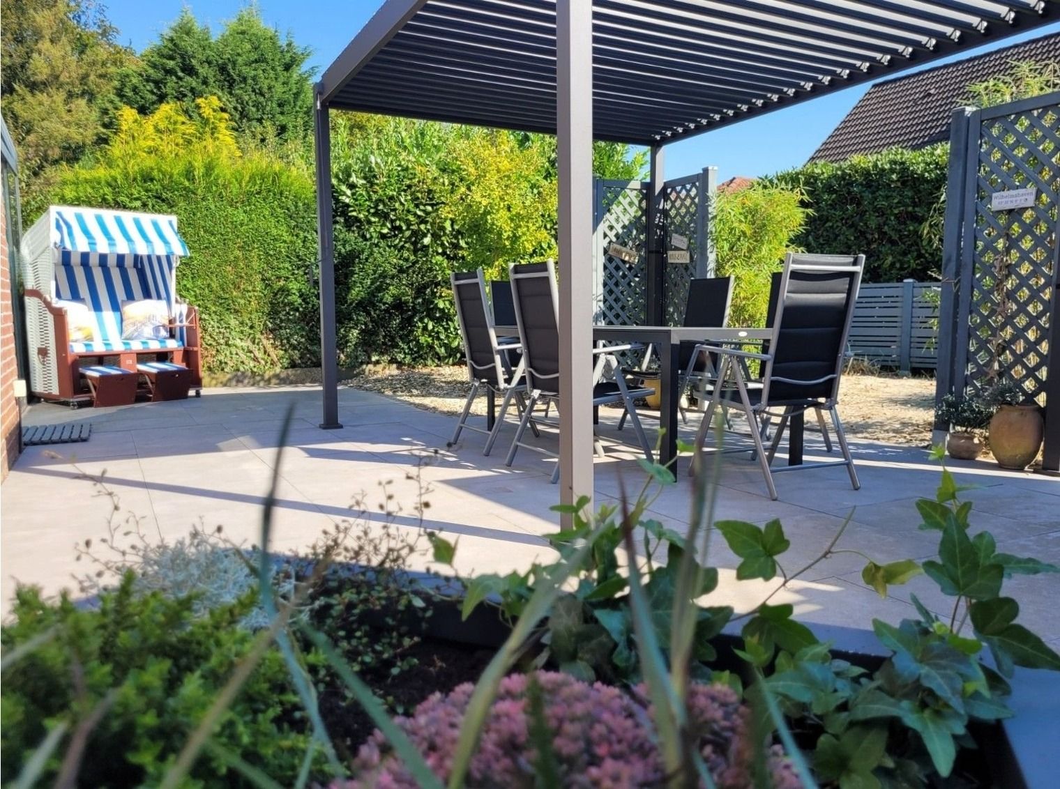 Terrasse mit Pergola, Gartenmöbeln & Strandkorb