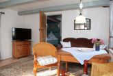 Im Erdgeschoss befindet sich der gemütliche Wohnbereich mit Kaminofen und TV, der besonders an kühleren Tagen eine behagliche Atmosphäre schafft. Die Küche ist mit Spülmaschine, Mikrowelle, Toaster, Wasserkocher, Kaffeemaschine, Kühlschrank mit Gefrierfach, Toaster, Herd, Backofen und allen wichtigen Kochutensilien ausgestattet – hier können Sie Ihre Lieblingsgerichte ganz bequem zubereiten. Angrenzend lädt das kleine Esszimmer mit Bauernecke zum gemeinsamen Essen und Verweilen ein. Ebenfalls im Erdgeschoss liegen das Schlafzimmer mit romantischem Bauernhimmelbett (ca. 1,35 m breit, auf Anfrage auch für eine 6. Person nutzbar) sowie das Badezimmer mit ebenerdiger Dusche und Föhn.