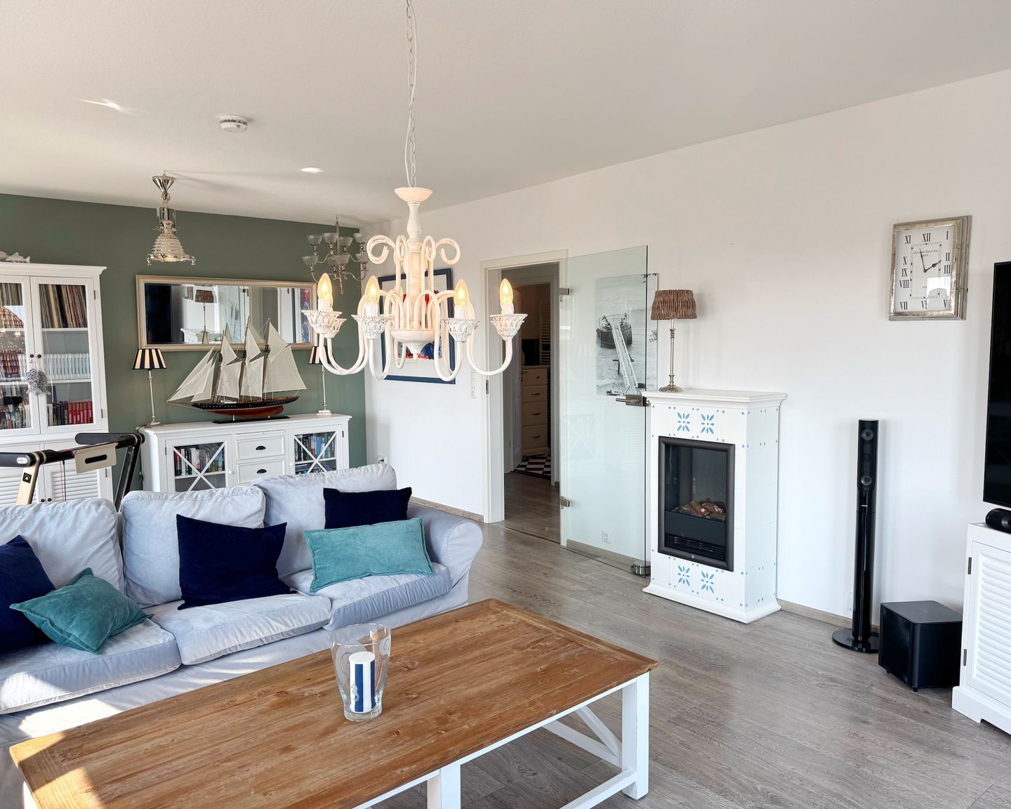 - einen gemütlichen Wohnbereich mit Elektrokamin,