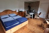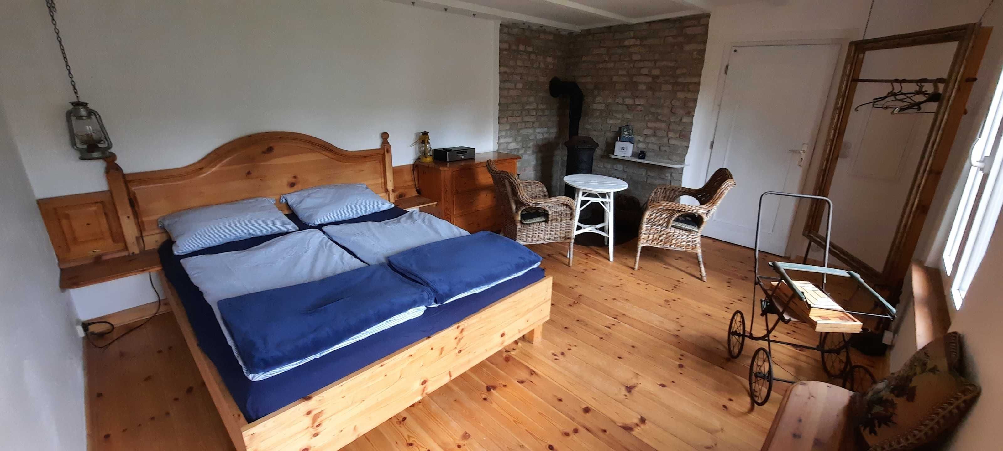 • 1 Schlafzimmer mit einem großen Doppelbett, Radio und Kamin