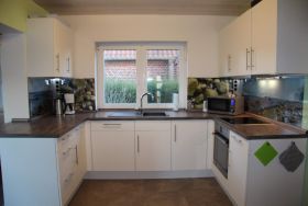 Die moderne Küche ist vollständig eingerichtet und verfügt unter anderem über Spülmaschine, großen Kühlschrank, Mikrowelle und Nespresso-Maschine. Eine Waschmaschine steht im Abstellraum bereit.