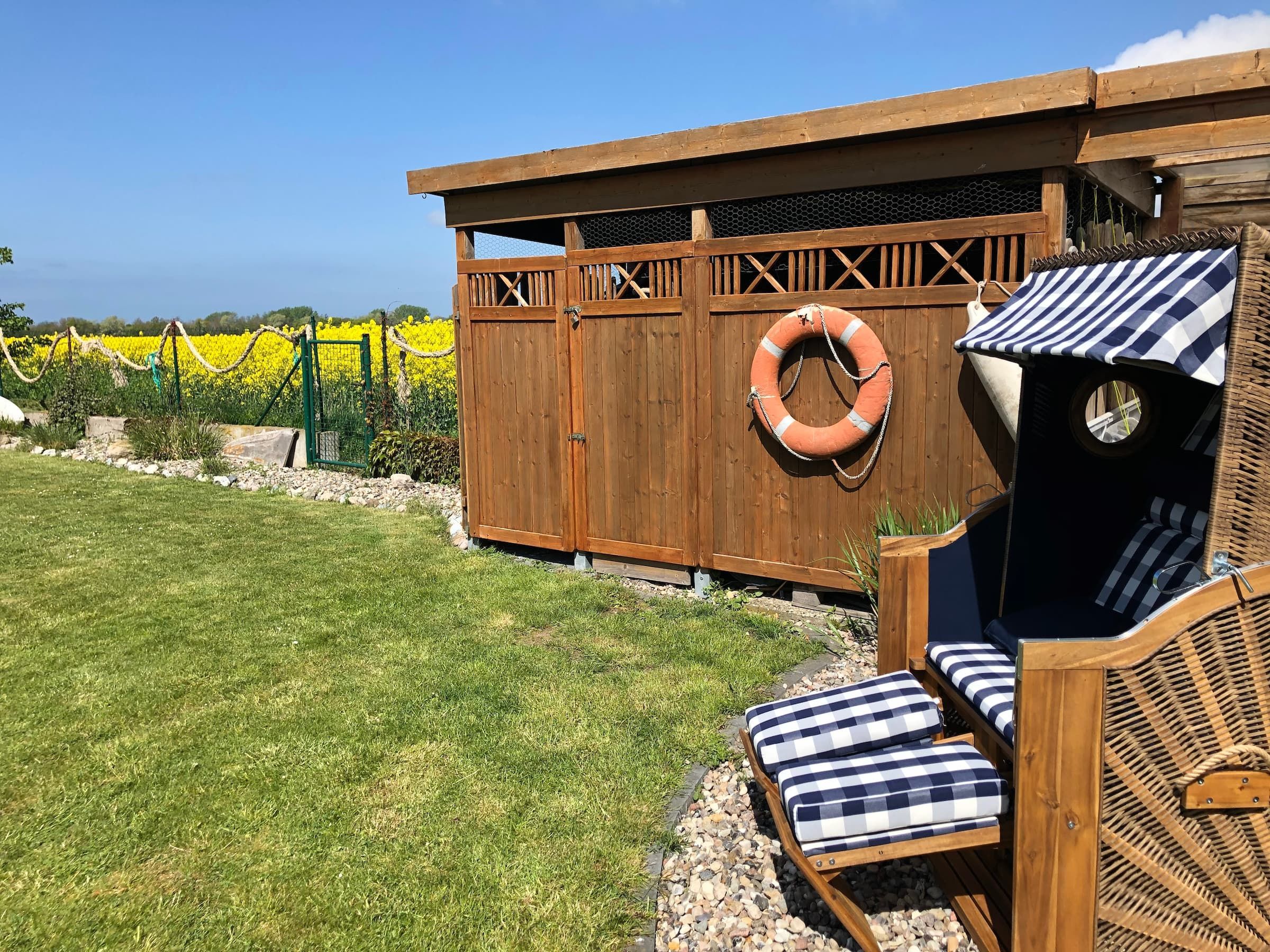 Direkt angrenzend liegt die Südterrasse, die mit Gartenmöbeln, Liegen, Strandkorb und Grill ausgestattet ist. Ob Sonnenbaden, gemeinsames Grillen oder einfach nur die frische Meeresluft genießen ? hier kommt Urlaubsstimmung auf.