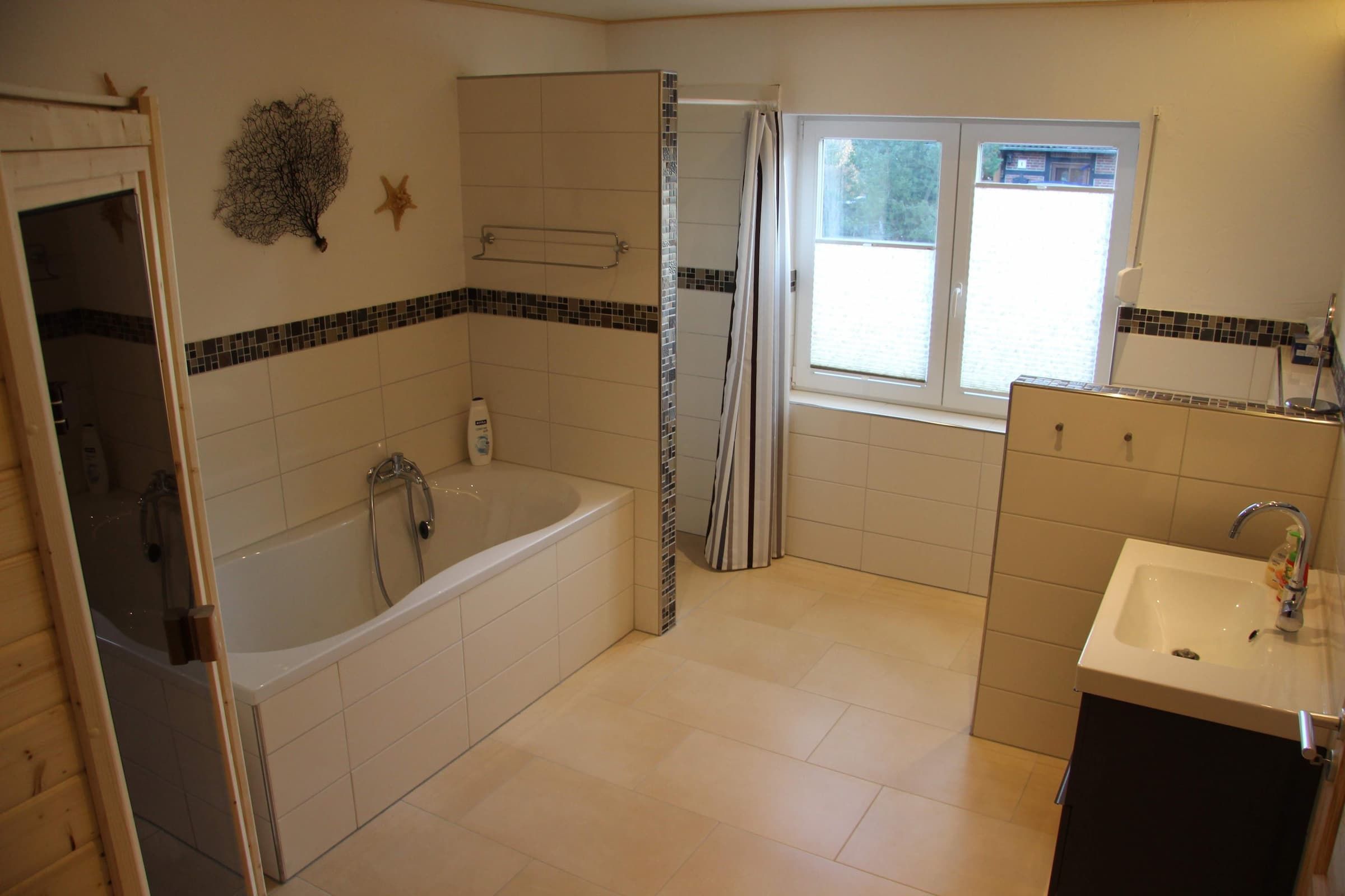 Das Wellnessbad im Erdgeschoss verwöhnt mit Dusche, Badewanne und Sauna perfekt zum Aufwärmen nach einem Strandspaziergang. Für zusätzlichen Komfort gibt es im Obergeschoss ein weiteres Badezimmer mit Dusche.