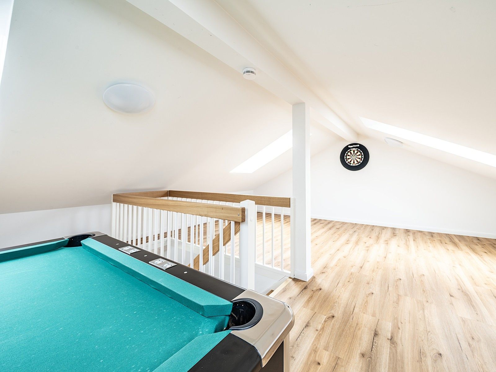 Die teilweise überdachte Terrasse und der weitläufige, eingezäunte Garten bieten ideale Bedingungen für gesellige Stunden im Freien. Ein Freizeitraum mit Billard und Darts ergänzt das Angebot und schafft zusätzliche Möglichkeiten für Unterhaltung.