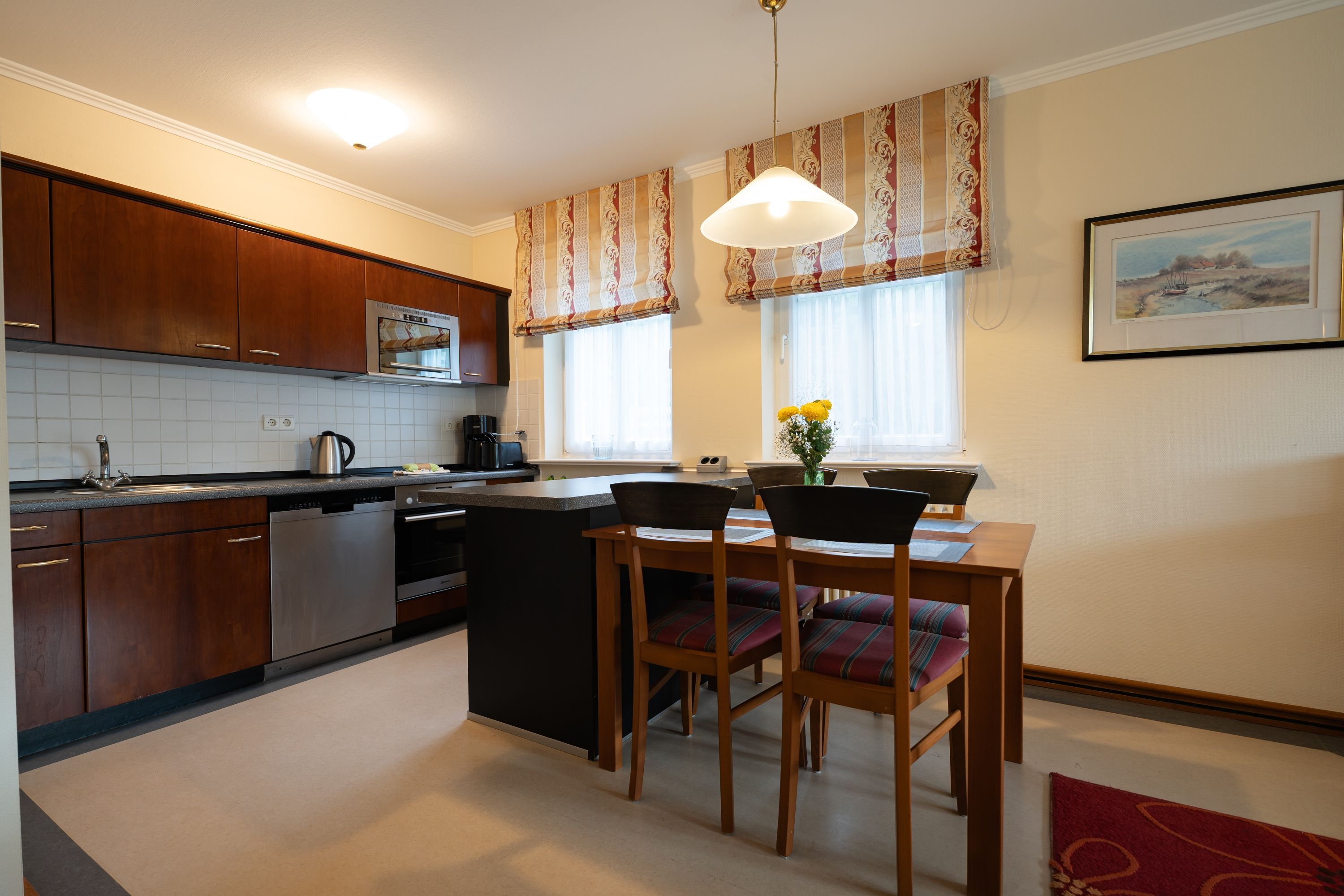 Ausstattung der großzügigen Komfort-Ferienwohnung im Erdgeschoss (2 Zimmer, Haus Nr. 02/Düne 4) mit großer Terrasse: