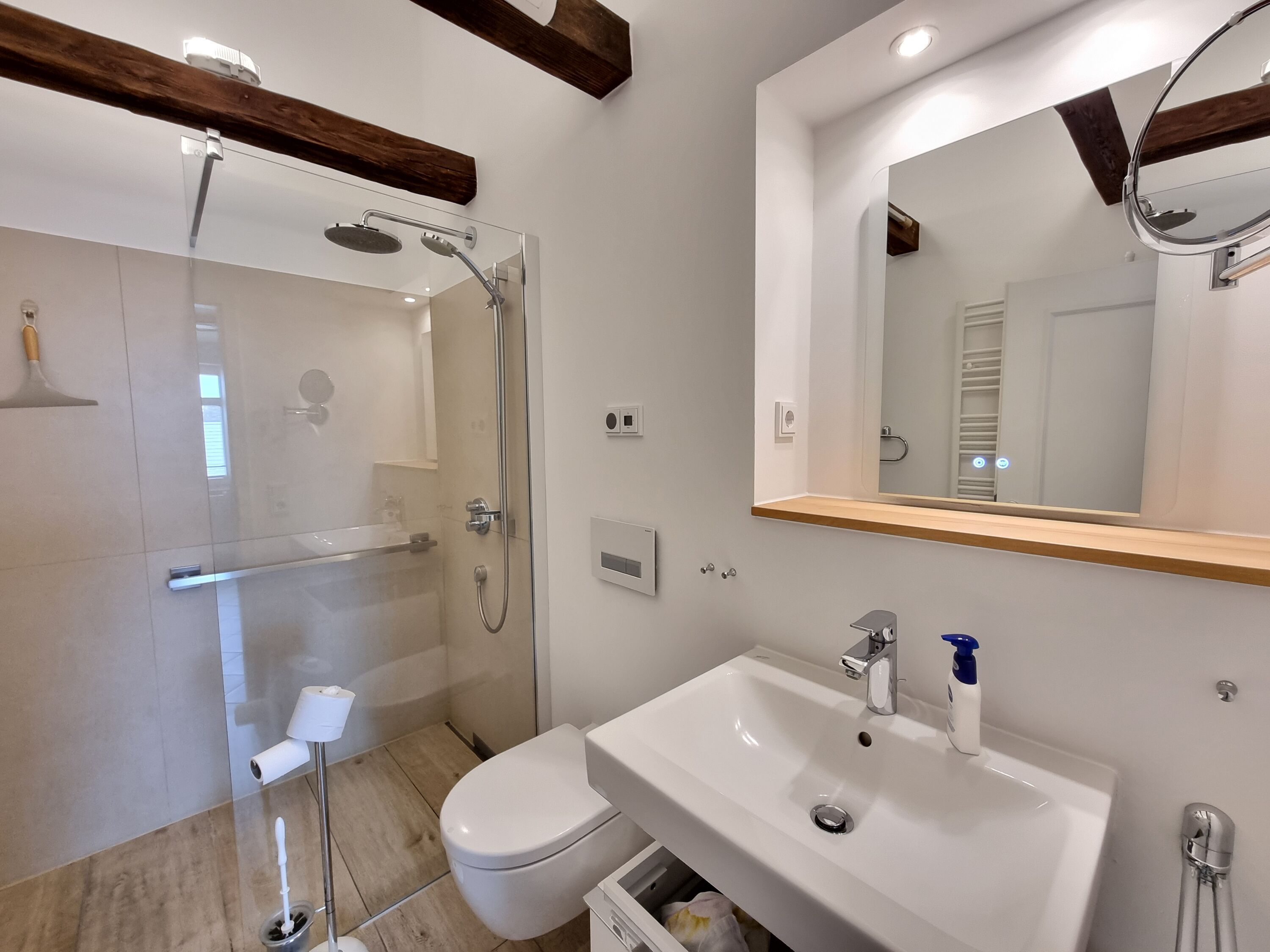 Das Badezimmer verfügt über eine ebenerdige Dusche.