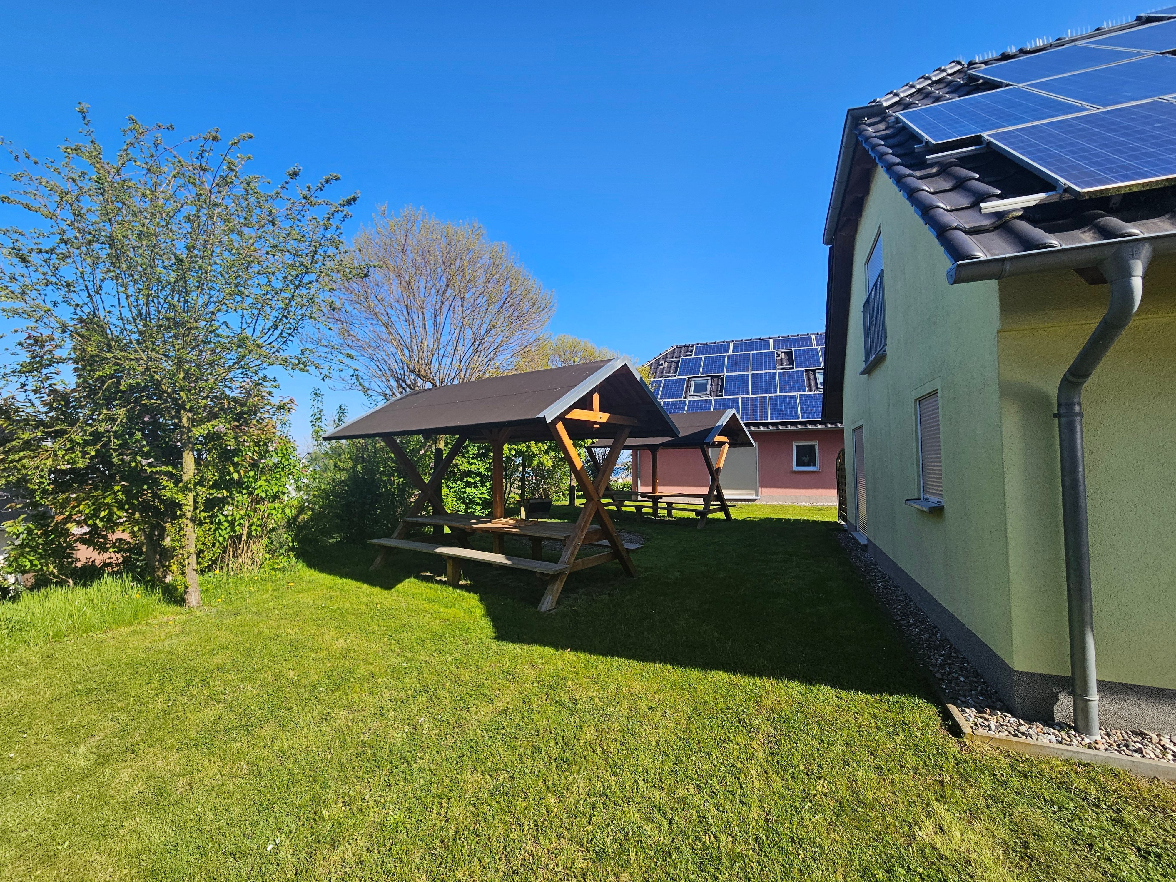 In das Obergeschoss gelangt man über eine offene Buchentreppe. Diese Etage ist offen gestaltet und in einen optisch abgetrennten Schlafbereich mit 2 Einzelbetten und einem großzügigen Wohnbereich mit Flat-TV und Schlafcouch (Aufbettungsmöglichkeit für die 5. Person) aufgeteilt.