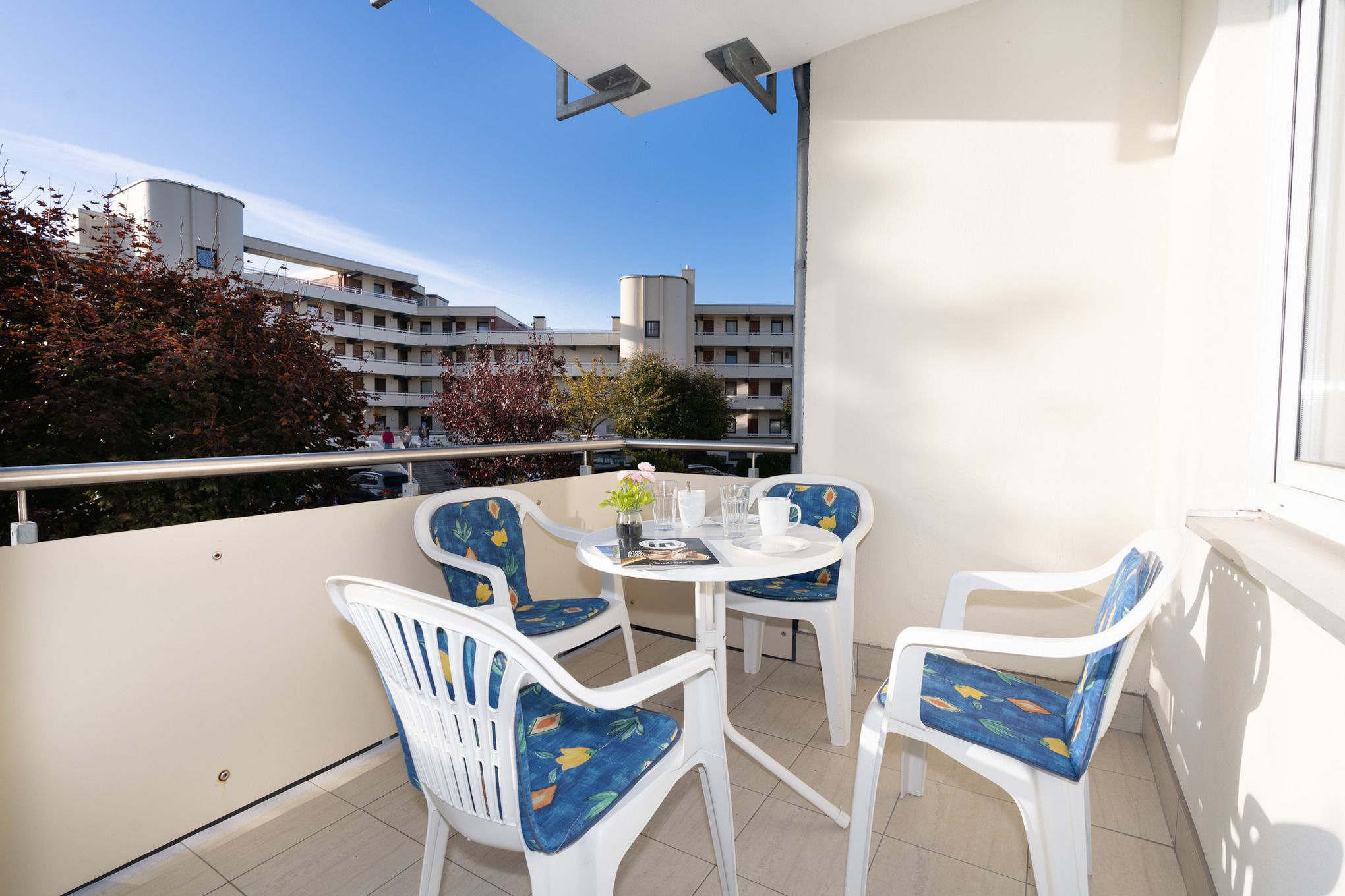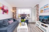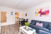 Der helle Wohnbereich bietet Ihnen nicht nur eine Couch-Ecke mit neuwertigem Schlafsofa und TV, sondern auch einen Essbereich für bis zu 4 Personen. Den sonnigen Süd-Balkon erreichen Sie ebenfalls über das Wohnzimmer. Ausgestattet mit einem Tisch und vier Stühlen, lässt sich hier hervorragend der Tag ausklingen. Kostenloses W-Lan steht Ihnen selbstverständlich zur Verfügung.