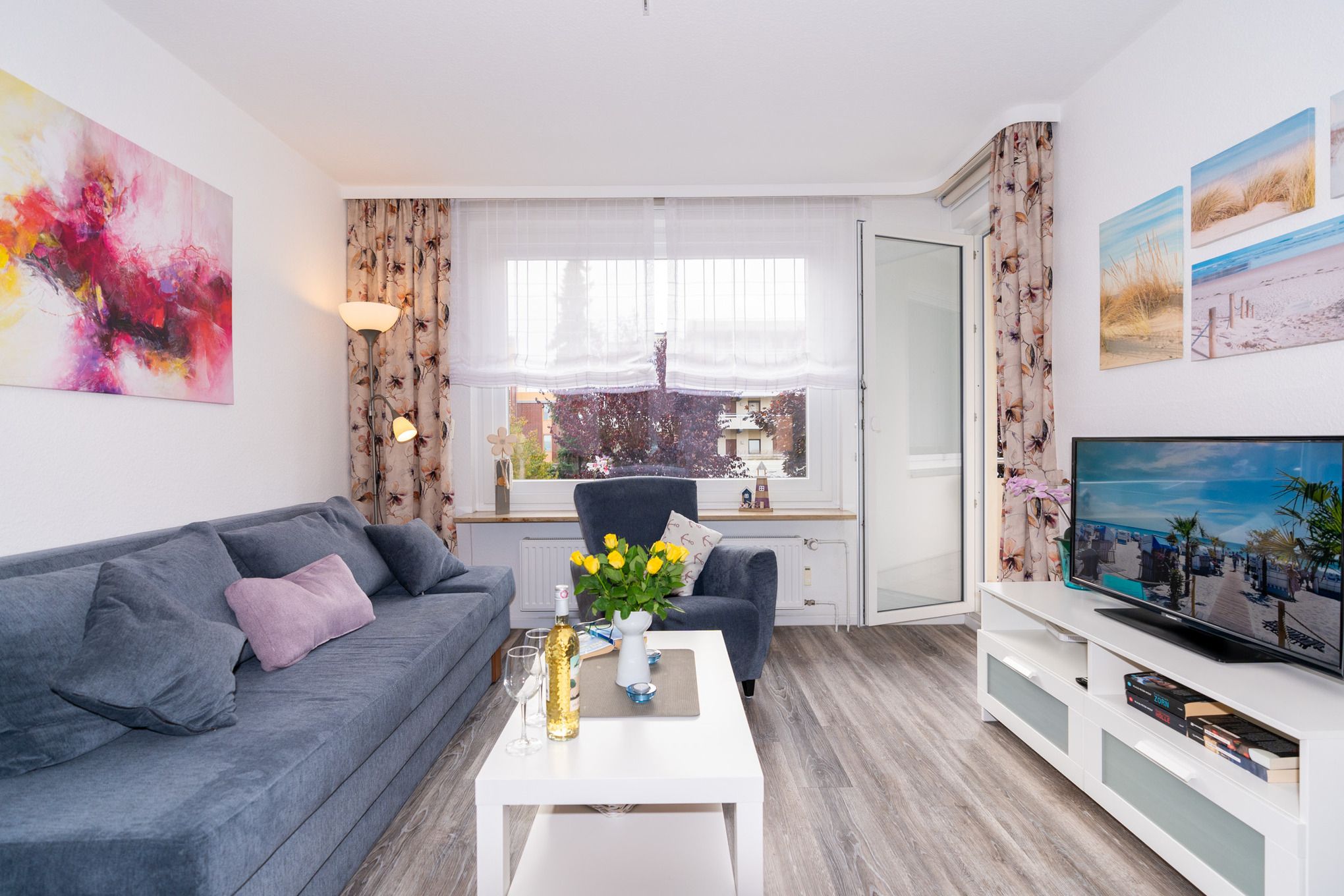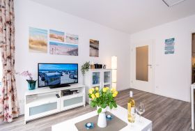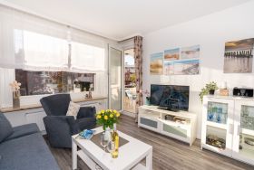 Diese 2-Zimmer-Ferienwohnung befindet sich im 1. Stock des Appartementhauses Wiking. Die Wohnung erreichen Sie bequem mit dem Fahrstuhl. Der neue Dünenpark von Grömitz mit diversen Restaurants, Bars, Einkaufsmöglichkeiten und Bäcker liegt nur wenige Schritte entfernt.
