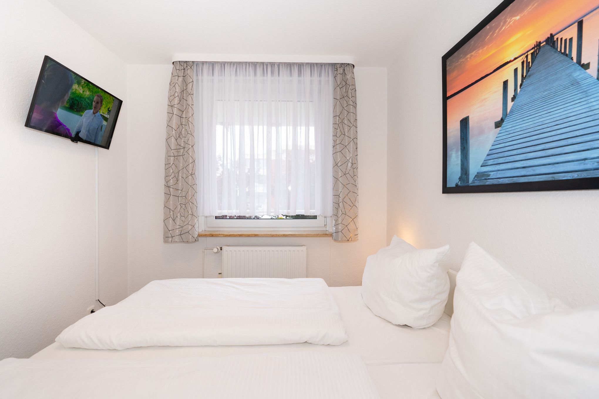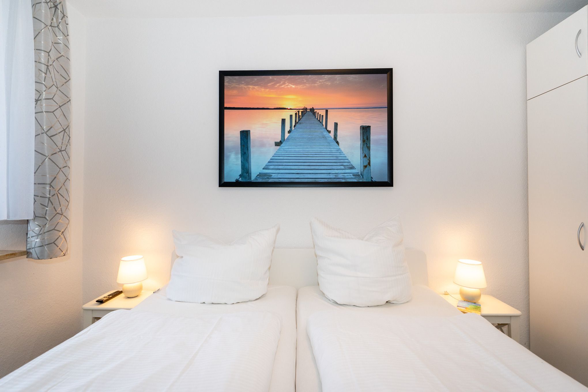 Das Schlafzimmer ist mit einem bequemen Doppelbett, einem Kleiderschrank, Nachttischen und einem zusätzlichen Flat-TV ausgestattet. Weitere Schlafplätze bietet die Schlafcouch im Wohnzimmer.