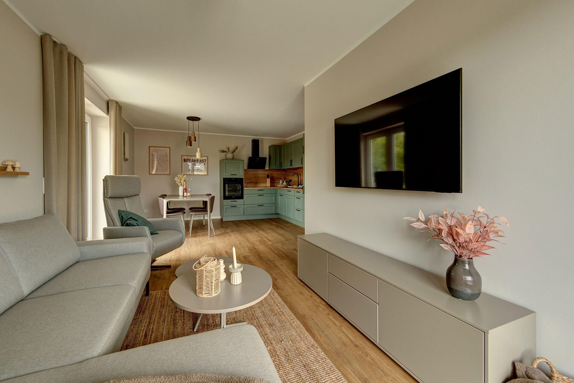 • Wohnbereich: Helles Wohnzimmer mit bequemer Couch, stilvollen Sesseln und Smart-TV. Große Fenster sorgen für viel Tageslicht, während warme Holztöne und geschmackvolle Deko eine wohnliche Atmosphäre schaffen.