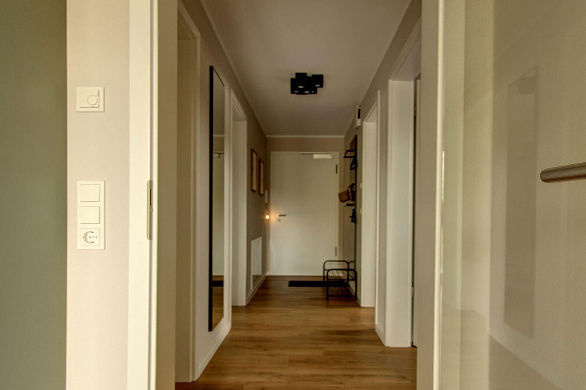 • Flur/Bereich: Geräumiger Eingangsbereich mit viel Stauraum, Garderobe und Spiegel.