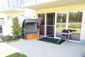 2 Zimmer Ferienwohnung im Ferienwohnpark Küstenwald mit Terrasse, Schlafzimmer, Küchenzeile, Bad mit Dusche und WC, Wohnzimmer mit Couch und Flachbild-TV, PKW-Stellplatz