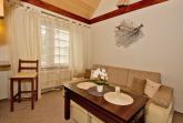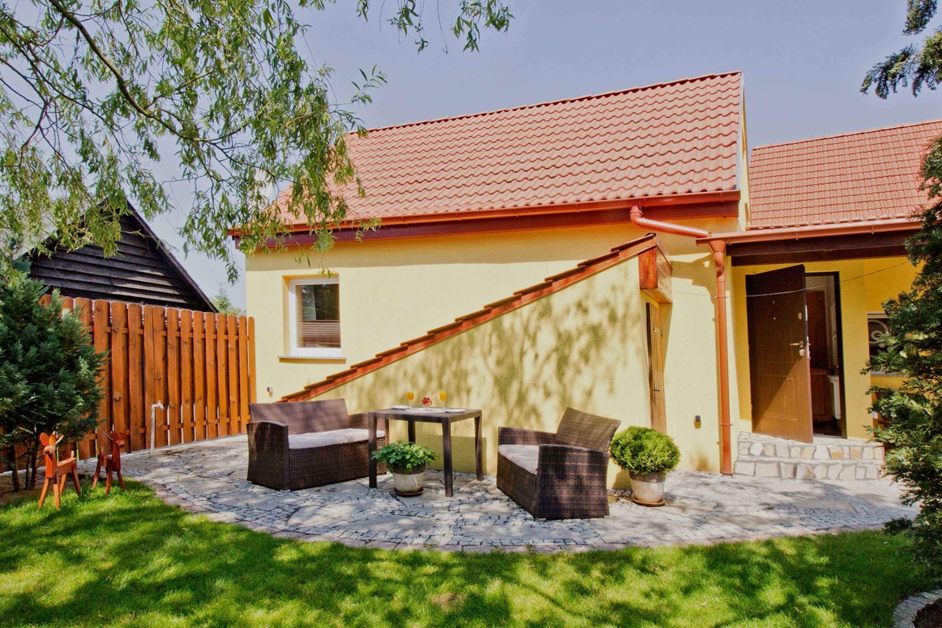 Das Ferienhaus, welches teilweise zur Strassenseite des Grundstücks gelegen ist, verfügt über 3 stilvoll und modern eingerichtete Zimmer (1 Wohn- und 2 Schlafzimmer), sowie ein Bad mit Dusche/WC (durch das Schlafzimmer zu erreichen) und eine offene Küche. Das Wohnzimmer mit Eckcouch und HDTV-Fernseher inkl. Radiofunktion lädt zum gemütlichen Verweilen ein. Das Schlafzimmer im Erdgeschoss verfügt über ein breites Doppelbett (Breite 160 cm) und eine Wohnwand inkl. Kleiderschrank. Die Loggia im Wohnzimmer ist ausgestattet mit zwei Einzelbetten und drei Kommoden. Klein, geräumig und gut ausgestattet- die offene Küche verfügt über eine Kochstelle mit 2 Herdplatten, Spüle, Kühlschrank, Toaster, Kaffeeautomat, Wasserkocher, Mikrowelle, sowie Geschirr und Kochuntensilien. Der Eingang befindet sich auf der ruhigen Hofseite. Direkt vor dem Ferienhaus befindet sich eine eigene gemütliche Sitzecke im ruhig gelegenen Garten der Ferienanlage inklusive Grill welcher zum Ferienhaus gehört.