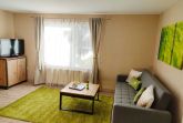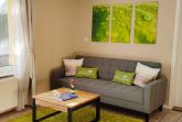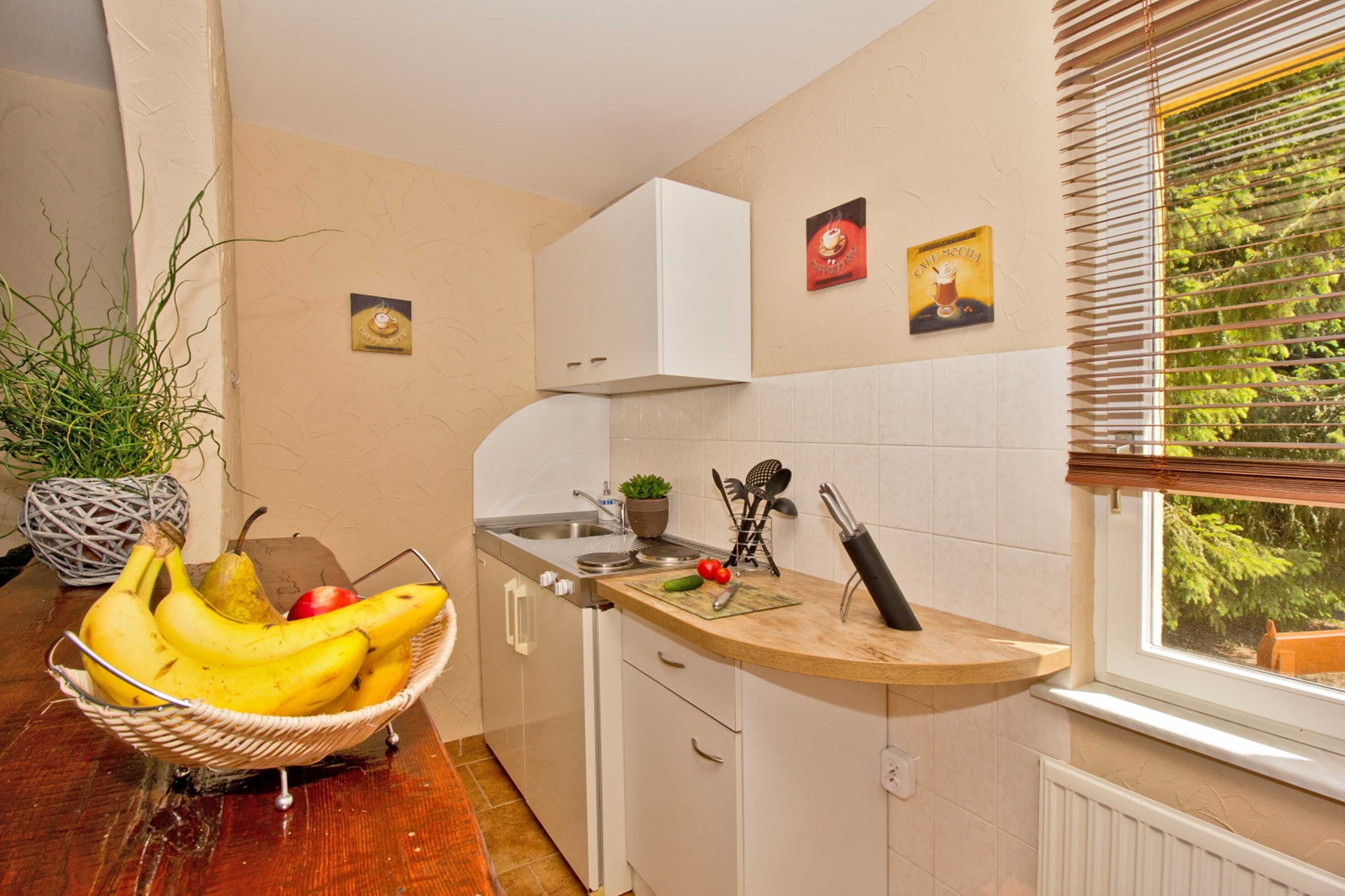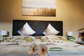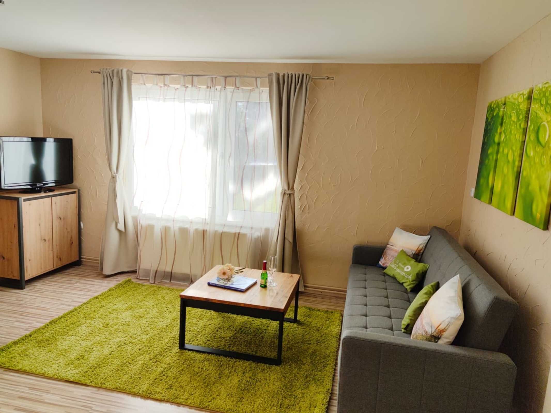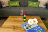 Die Ferienwohnung mit Blick auf den Hof, Garten und Golfplatz verfügt über 1 großes stilvoll und modern eingerichtetes kombiniertes Wohn- und Schlafzimmer, ausgestattet mit einem breiten Doppelbett (Breite 160 cm), Kleiderschrank, Kommode, einer gemütlichen Schlafcouch (Breite Schlaffunktion 140 cm), sowie einem LED Fernseher mit Radiofunktion. Ein eigenes Bad mit Dusche und WC ist in der Wohnung integriert. Genießen Sie Ihr Frühstück auf Ihrer eigenen Natursteinterrasse. Klein, geräumig und gut ausgestattet- die offene Küche mit einem Hochtisch zum Essen und Trinken verfügt über eine Kochstelle mit 2 Herdplatten, Spüle, Kühlschrank, Toaster, Kaffeeautomat, Wasserkocher, sowie Geschirr und Kochuntensilien.