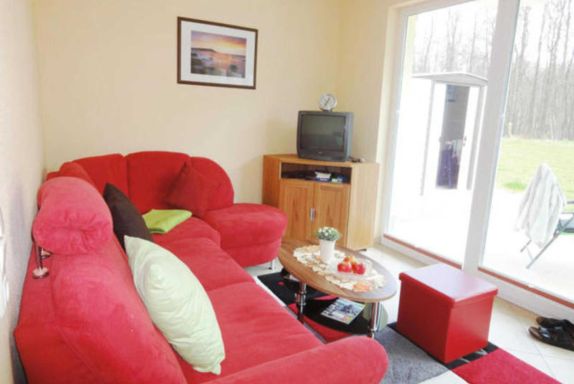 2 Zimmer Ferienwohnung im Ferienwohnpark Küstenwald mit Terrasse, Schlafzimmer, Küchenzeile, Bad mit Dusche und WC, Wohnzimmer mit Couch und Flachbild-TV, PKW-Stellplatz
