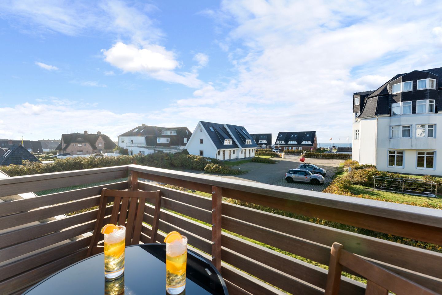 Sowohl die Terrasse als auch der Balkon sind nach Westen ausgerichtet und laden zu entspannten Nachmittagen und lauen Abenden im Freien ein. Ob ein Kaffee in der Nachmittagssonne oder ein Glas Wein zum Sonnenuntergang – hier genießen Sie Sylt ganz privat.