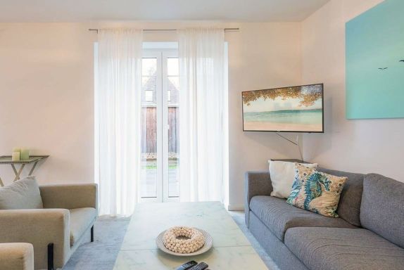 Kleine Flucht, 4-Zimmer-Doppelhaushälfte 120 m2 auf 2 Stockwerken. Sehr stilvoll und gemütlich eingerichtet: offenes Wohn-/Esszimmer mit Sat-TV (Flachbildschirm). Ausgang zur Terrasse. Grosse, offene Küche (4 Kochplatten, Backofen, Geschirrspüler, Toaster, Wasserkocher, Tiefkühler, elektrische Kaffeemaschine) mit Esstisch. Dusche/WC. Bodenheizung. Obergeschoss: 2 Zimmer, jedes Zimmer mit 1 Doppelbett (1 x 180 cm, Länge 200 cm). 1 Zimmer mit 2 Betten (90 cm, Länge 200 cm). Bad/Dusche/WC. Terrassenmöbel, Gartengrill, Liegestühle. Zur Verfügung: Kinderhochstuhl, Babybett. Internet (Wireless LAN). Parkplatz (überdacht). Bitte beachten: geeignet für Familien. Nichtraucher-Unterkunft. Maximal 1 Haustier/Hund erlaubt.