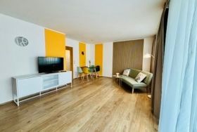 Es verfügt über ein ruhiges Schlafzimmer und ein gemütliches Wohnzimmer mit Schlafmöglichkeit für zwei weitere Gäste. Alle Räume sind mit Verdunklungsvorhängen ausgestattet. Das moderne Bad mit Dusche und Waschmaschine sorgt für zusätzlichen Komfort.