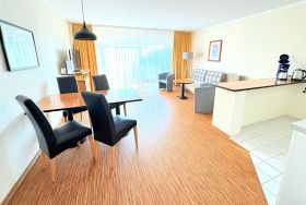 Der offene Wohnbereich mit bequemer Doppelschlafcouch und Sesseln lädt zum Entspannen ein. Dank der großen bodentiefen Fenster ist der Raum lichtdurchflutet und vermittelt ein angenehmes Wohngefühl.