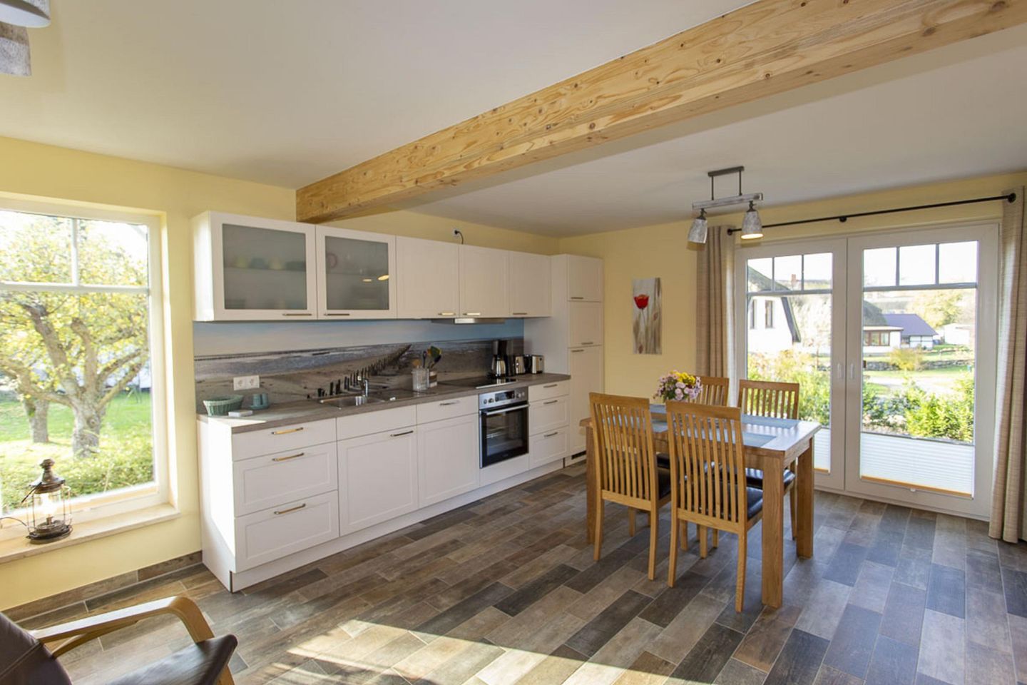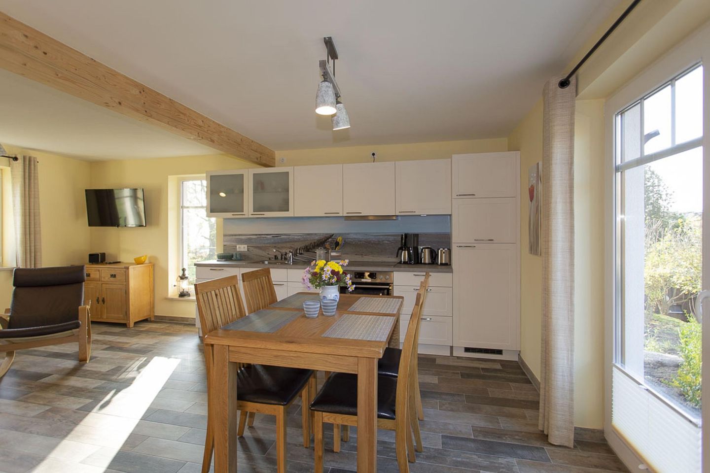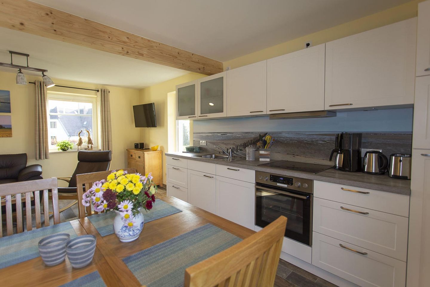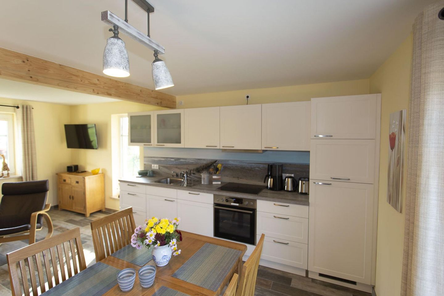 KÜCHE // offene Küche mit 4-Felder Ceranherd, Kühlschrank mit Gefrierfach, Backofen, Toaster, Wasserkocher, Kaffeemaschine, reichlich Besteck, Geschirr und Küchenutensilien ++