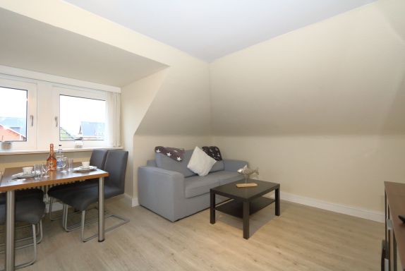 Im Wohnzimmer ist eine bequeme Schlaf-Couchgarnitur mit Clubtisch und Sessel. Eine kleine Eßecke für 4 Personen schließt sich daran an.