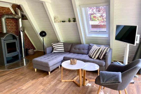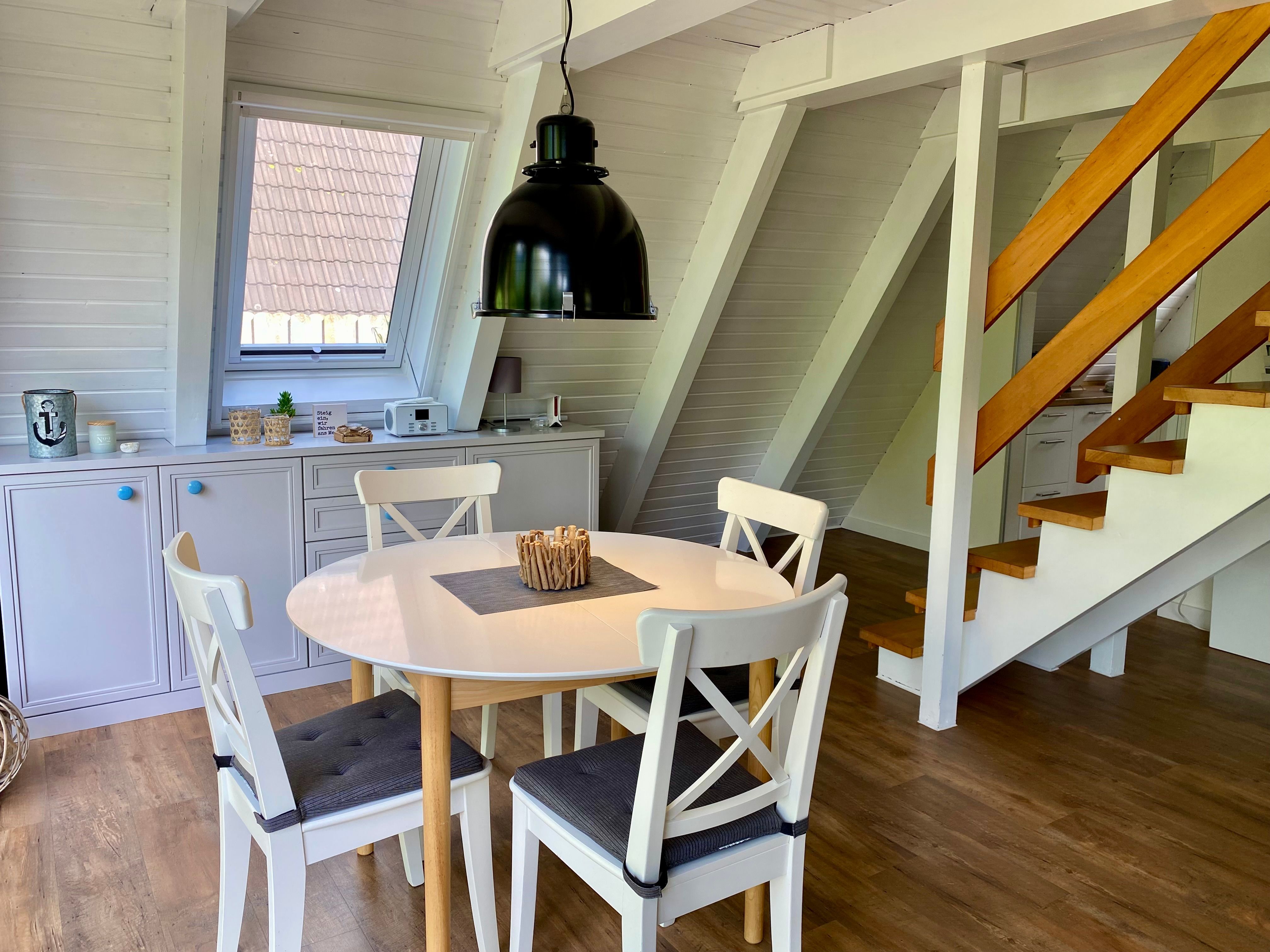 Gemütlichkeit mag, wird sich hier wohlfühlen: Der Wohn- und Essbereich ist weiß und grau