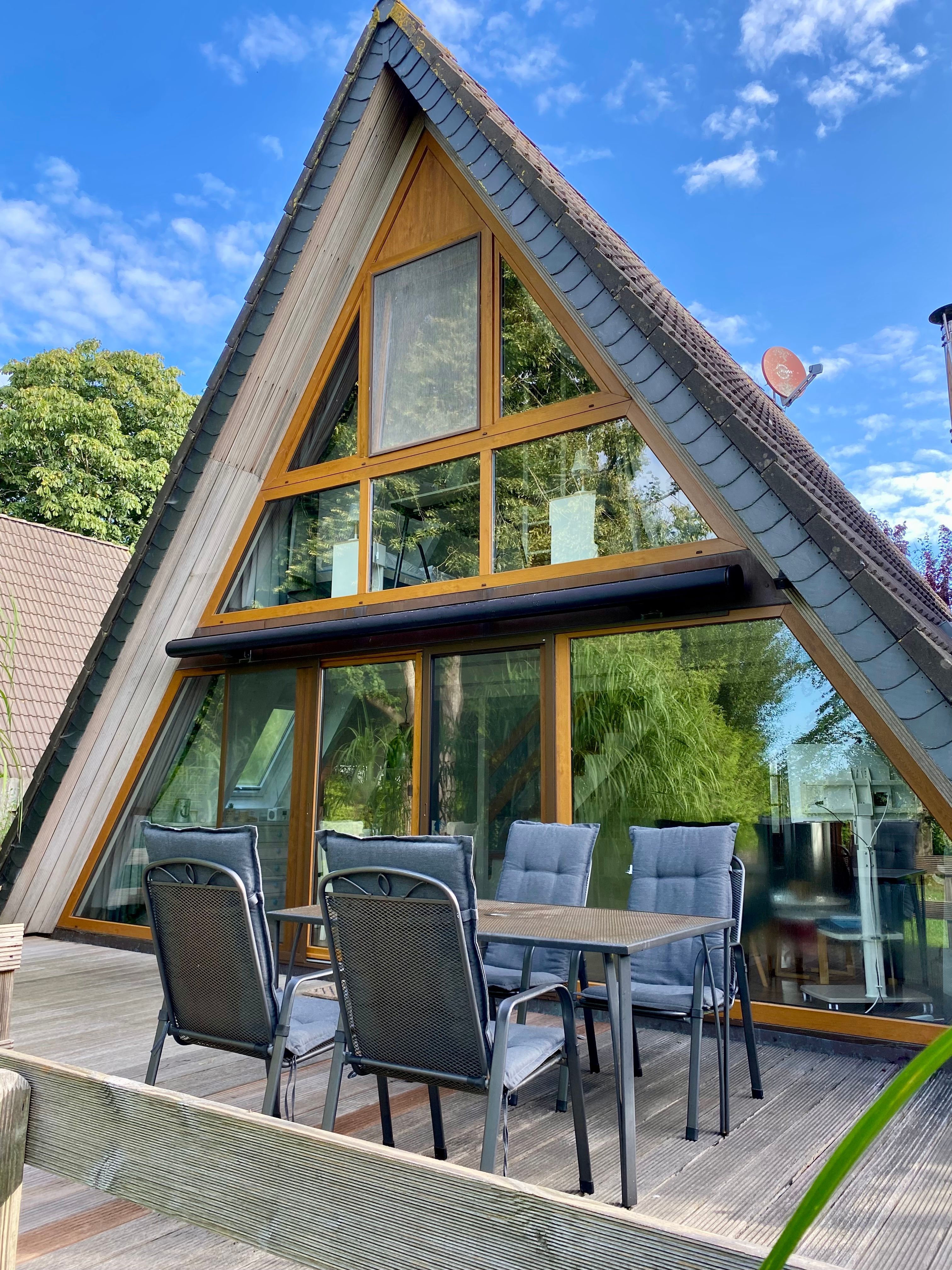 Das Nurdachhaus verfügt über eine große Terrasse mit einer Markise und Terrassenmöbeln,