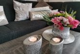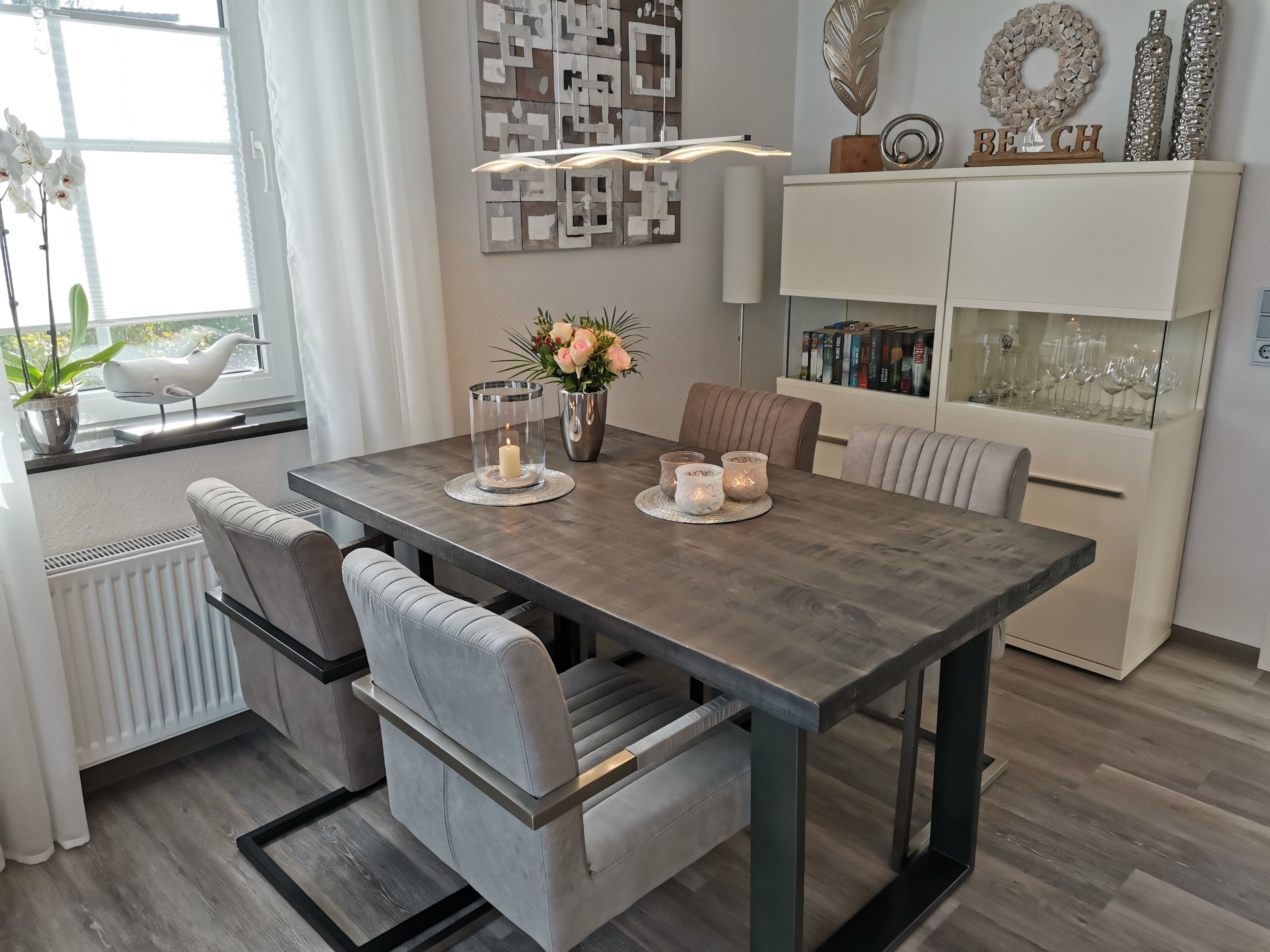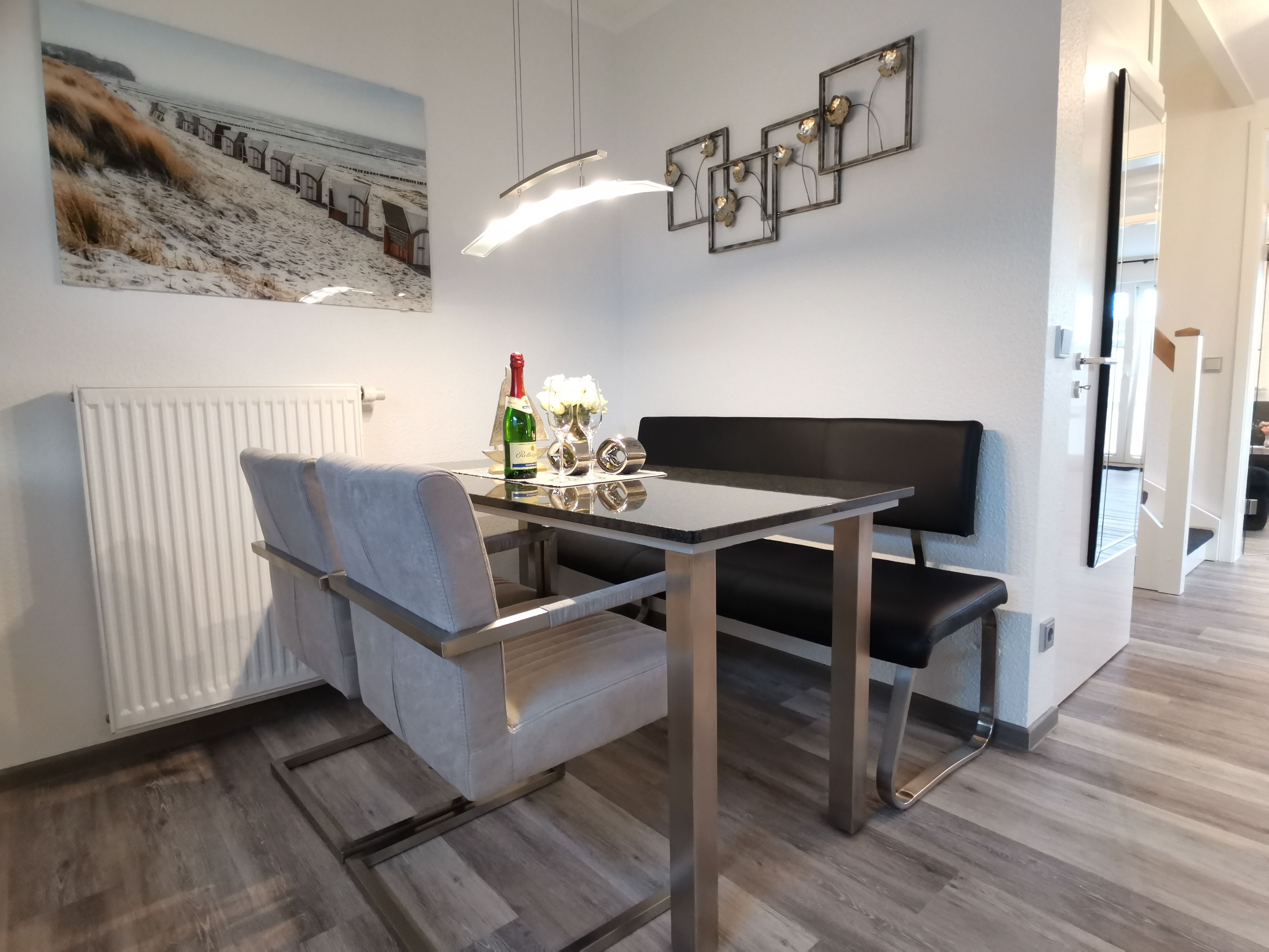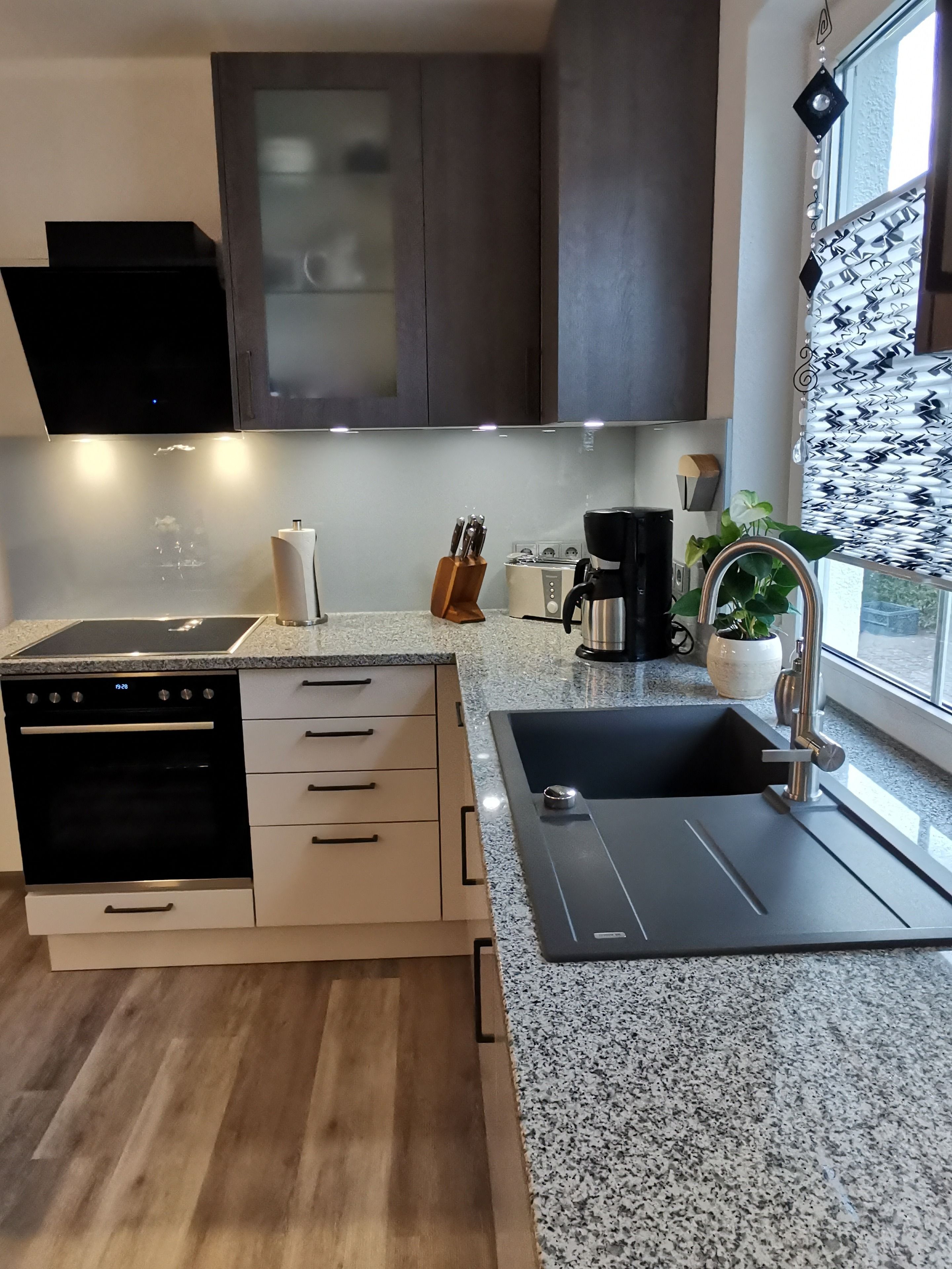 Die moderne und funktionale neue Küche ist hochwertig mit allem ausgestattet, was für die mühelose Selbstverpflegung im Urlaub nötig ist. Essplatz mit zwei Stühlen und einer Bank, Hoch- u. Trip-Trapstuhl. Inkl. eingebautem Internetradio.