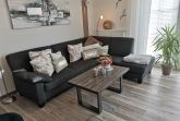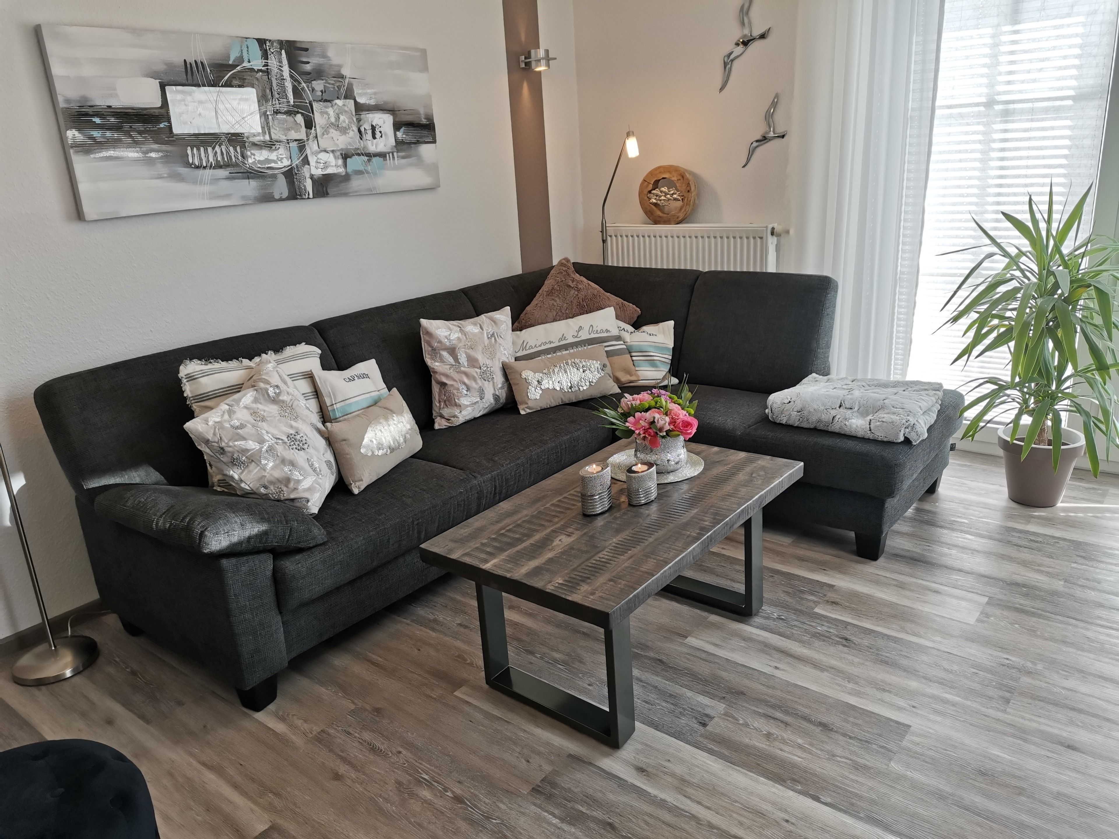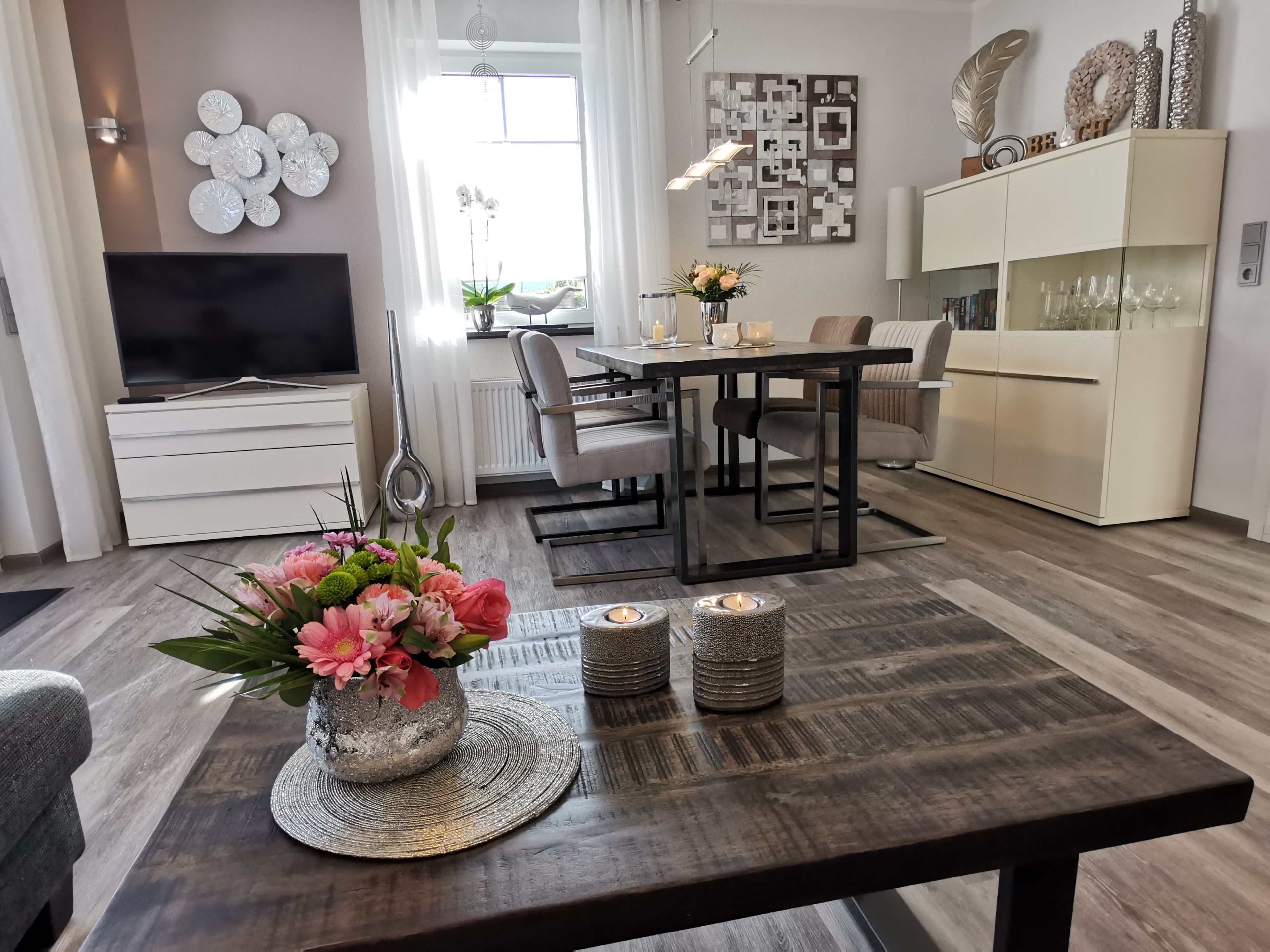 Im hellen und großzügigen Wohnbereich befinden sich ein Smart-TV und ein neuer Holztisch mit Stühlen zum geselligen Speisen, Spielen und Klönen. Bequemes großes Sofa, ausgestattet mit vielen Kissen und kuscheligen Decken. Fernsehsessel mit Hocker, Lampe und Ablage. Es gibt eine große Anzahl an Spielen, Bauklötzen, Duplosteinen, Malbüchern, Wissens-/Quizspielen. Viele gute Romane und Kinderbücher stehen bereit.