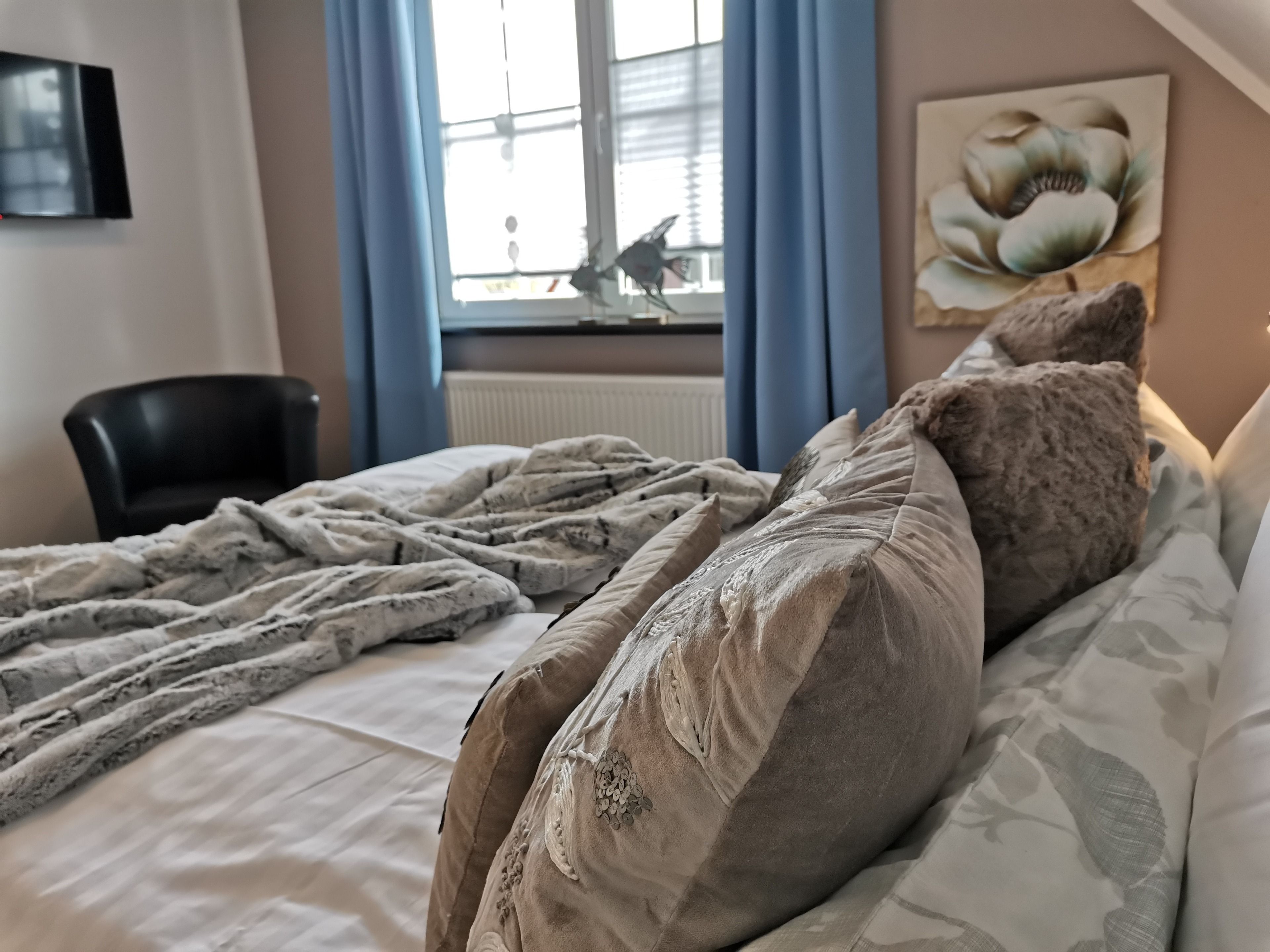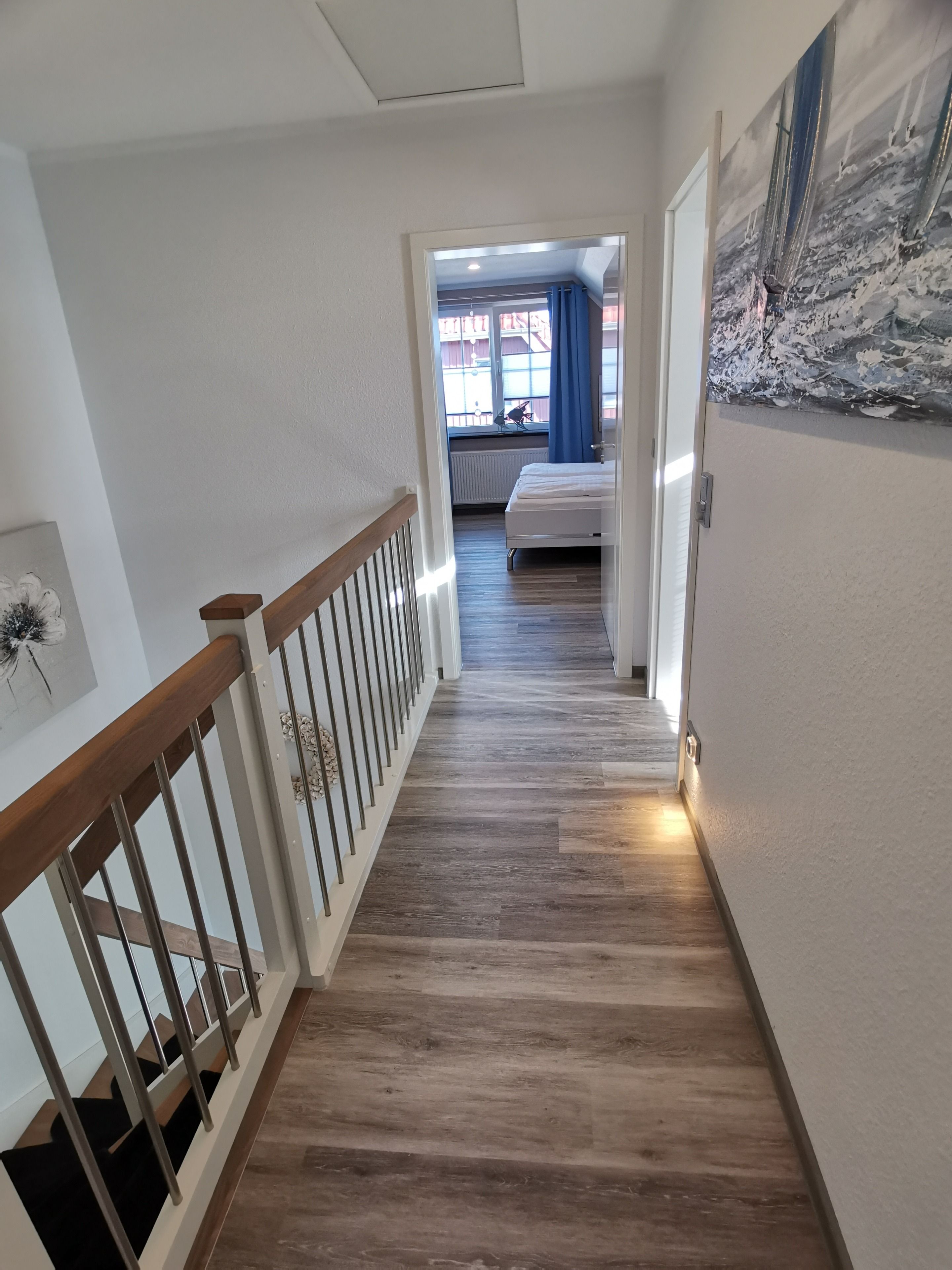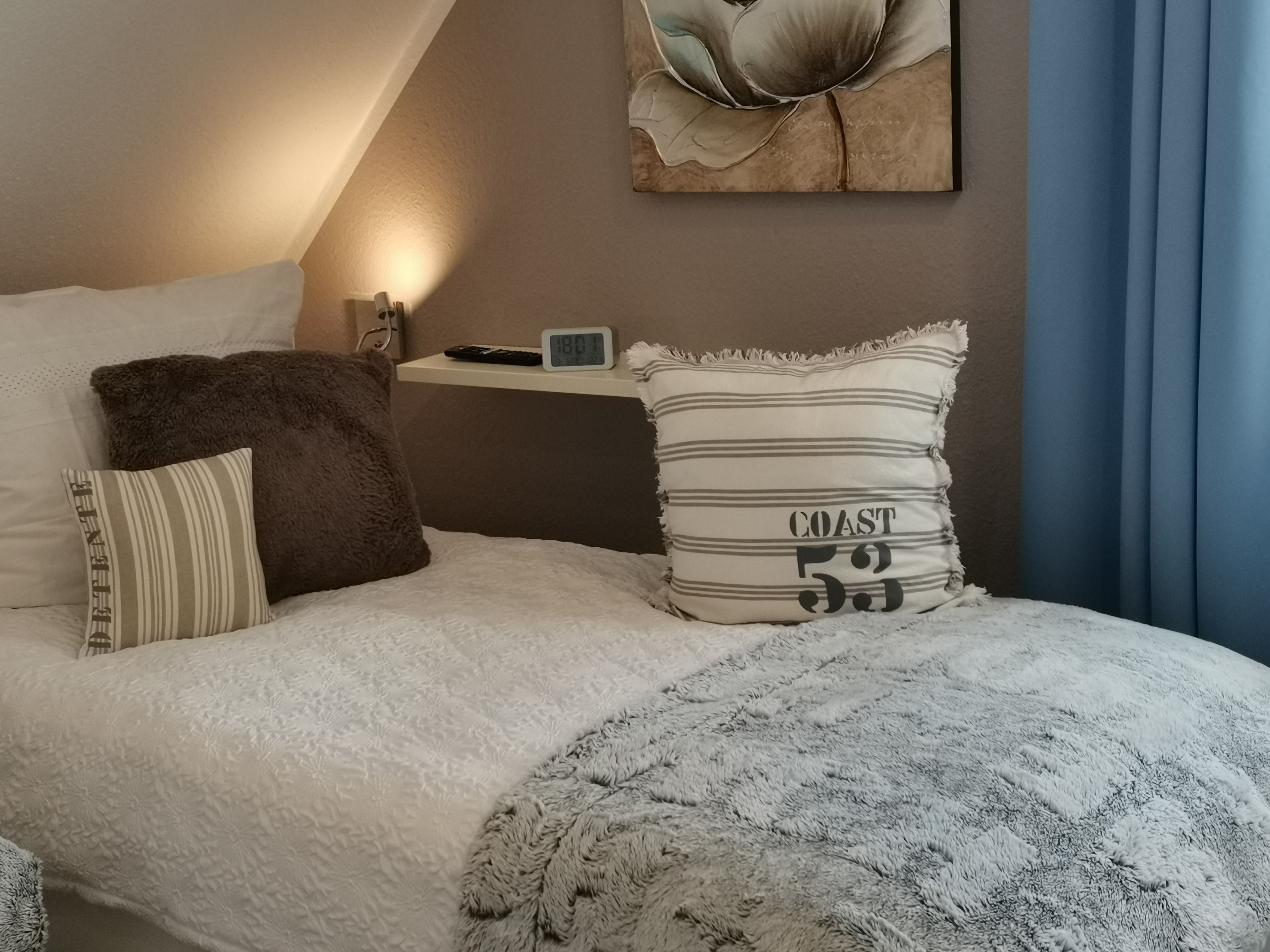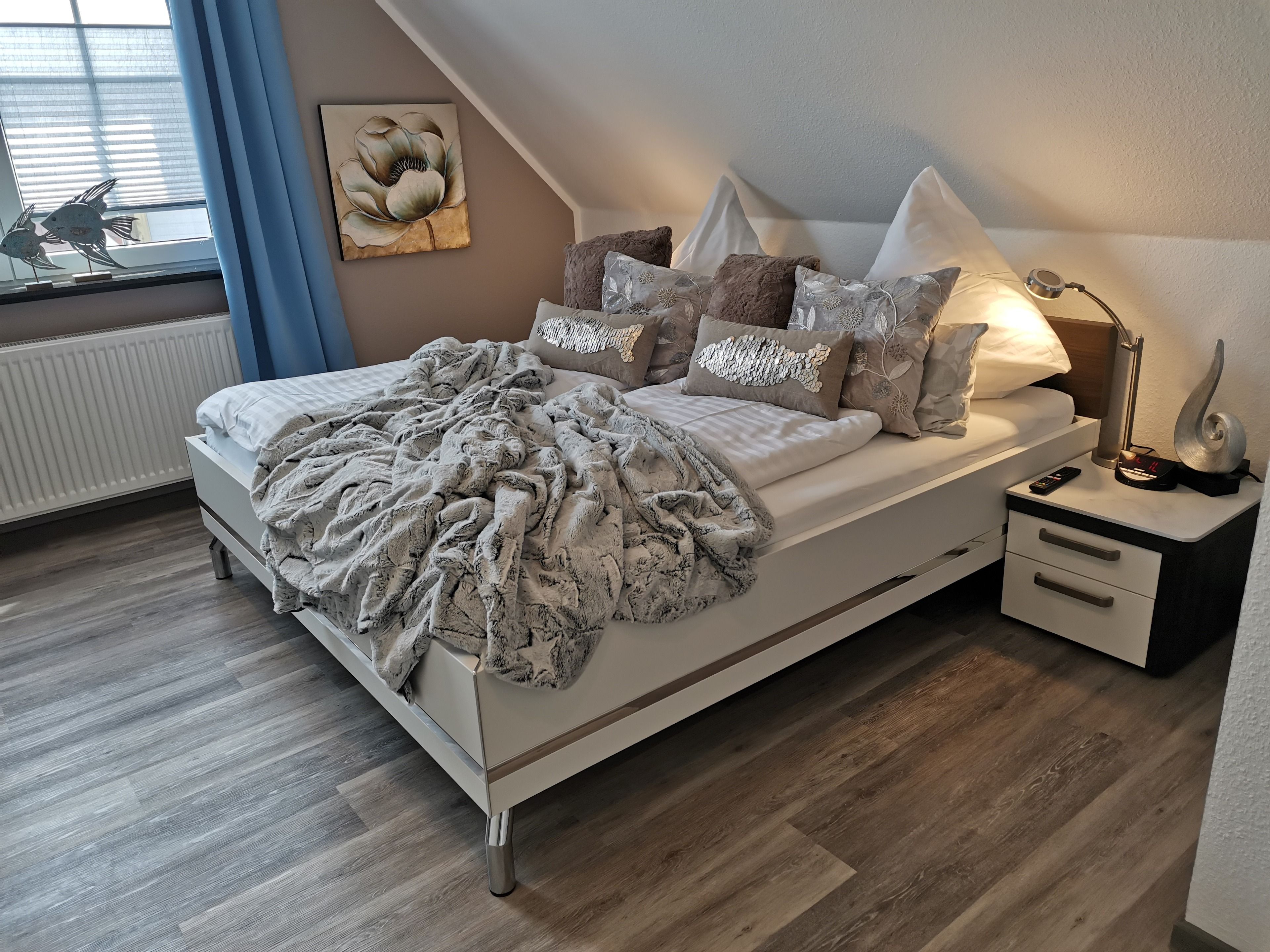 Die zwei Schlafzimmer im Obergeschoss sind über eine neue Holztreppe zu erreichen, mit integriertem Kinderschutzgitter. Im ersten großen Schlafraum befindet sich ein hochwertiges Doppelbett, Sessel, 2,60 Meter Kleiderschrank mit reichlich Stauraum, ausreichend Kleiderbügeln und neues Smart-TV. Beidseitig verstellbare Lattenroste mit getrennten bequemen Matratzen, verschiedene Härtegrade. Allergikergeeignete Bettwaren für Sommer und Winter. Extrakopfkissen der Größe 40x80 cm.