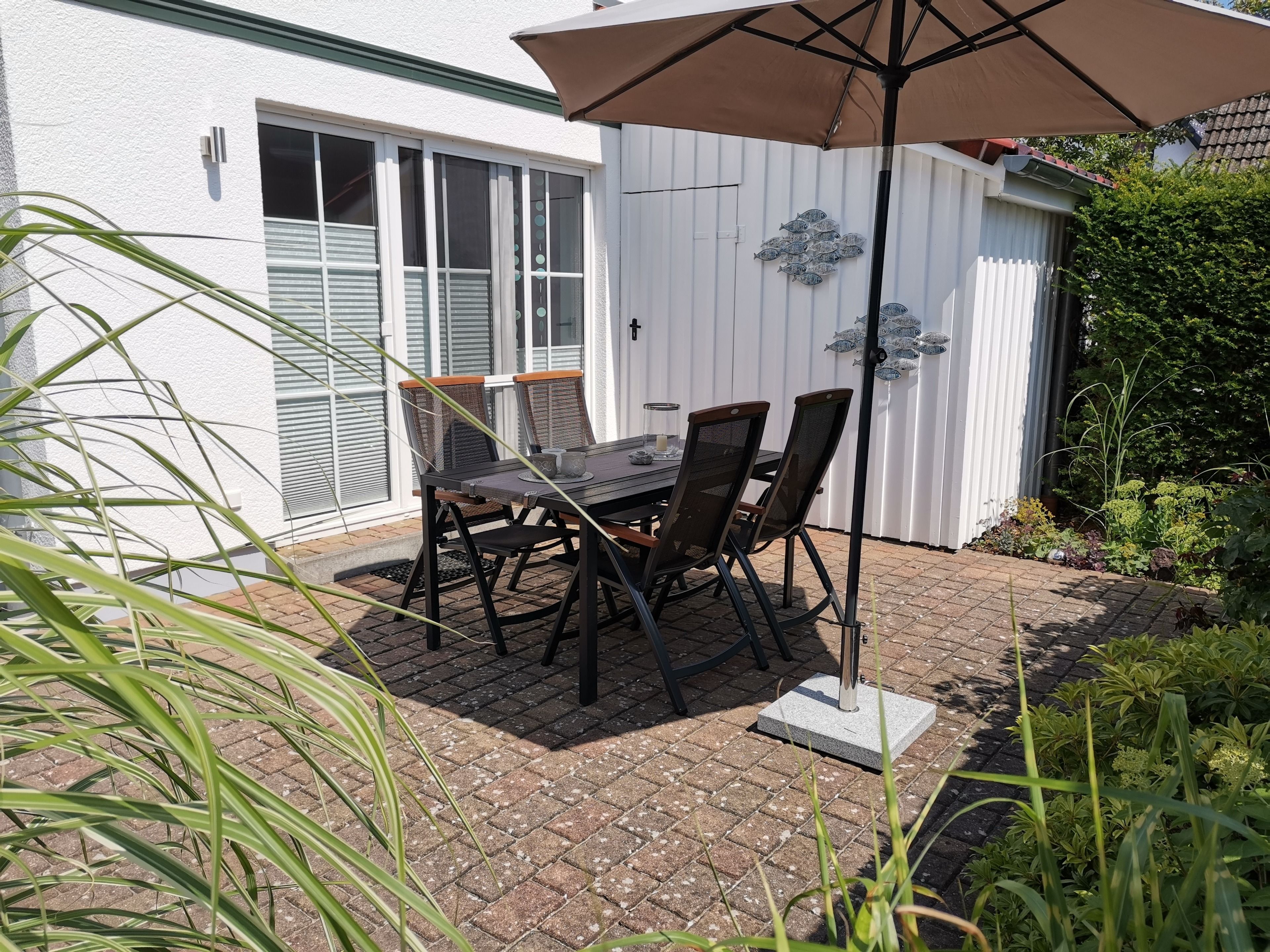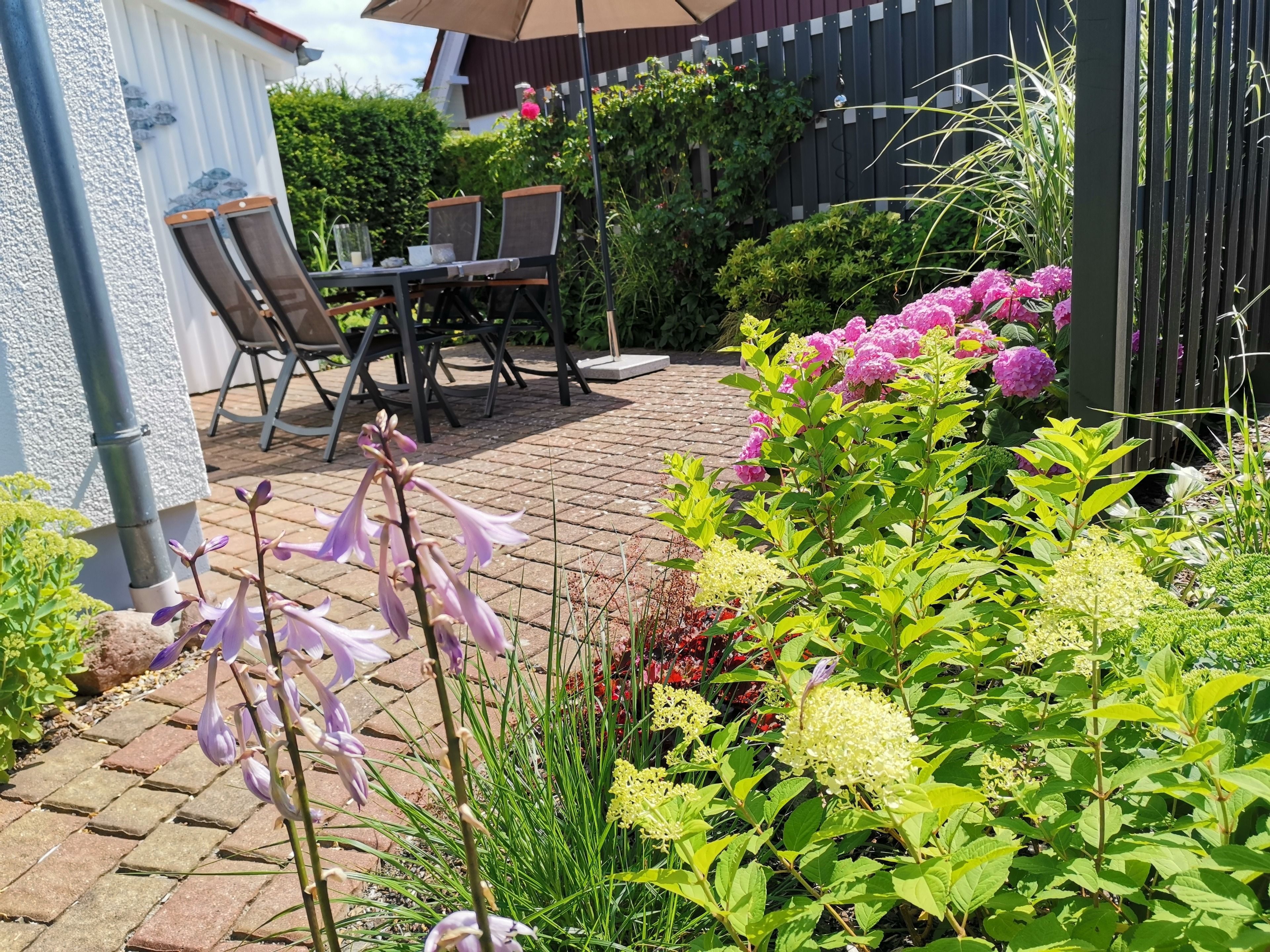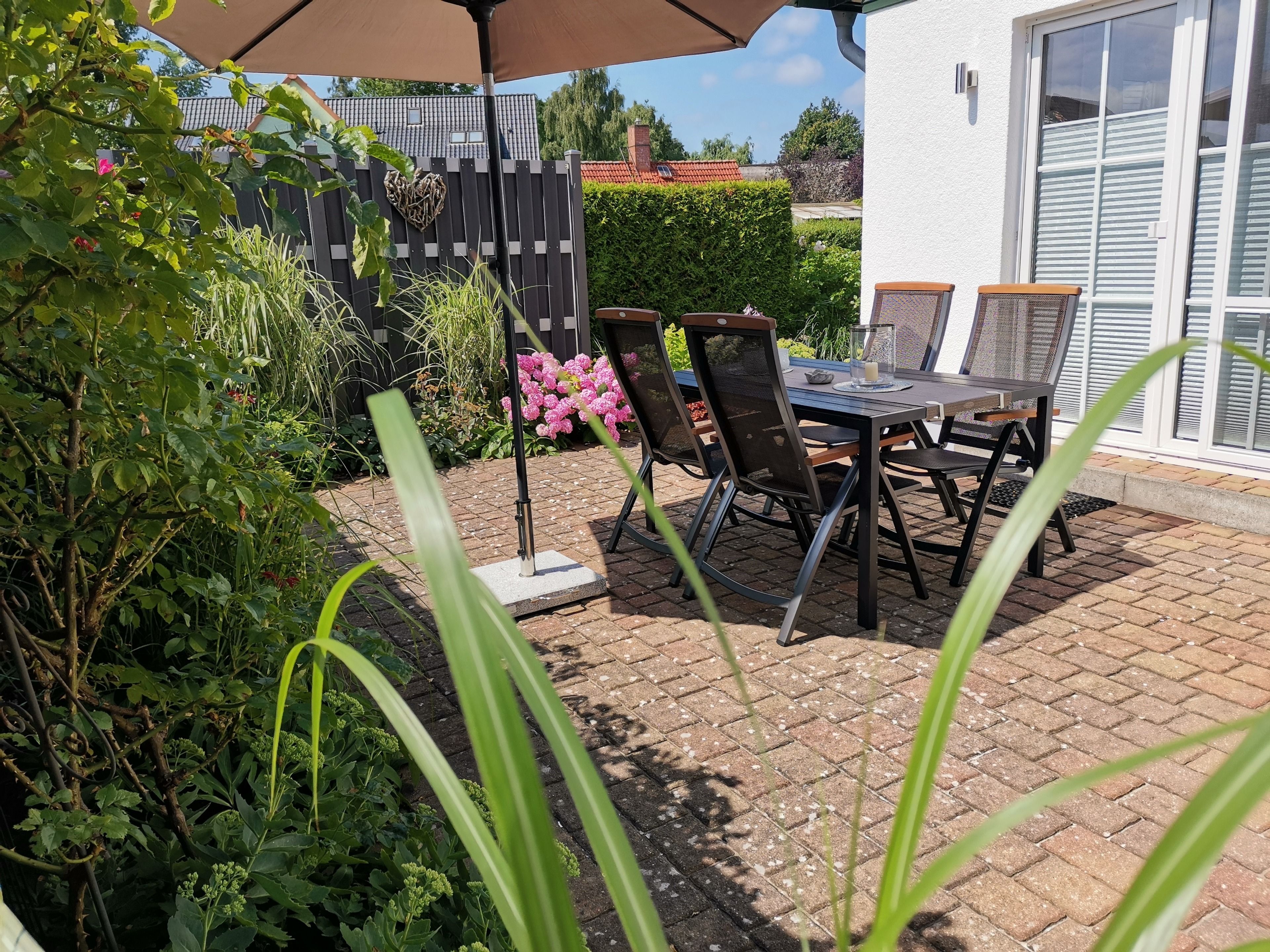 Herrlich entspannen können Sie auf der großen geschützten S/W-Terrasse! Im Gartenhaus finden Sie 5 verstellbare Stühle und 1 Liege, Gartenhochstuhl, Sonnenschirm, Bollerwagen, Strandspielzeug, Windschutz, Strandliege, Sonnenschirm für den Strand, Wäscheständer mit Klammern und Grill mit Anzündern. Zwei Parkplätze und Fahrradständer.