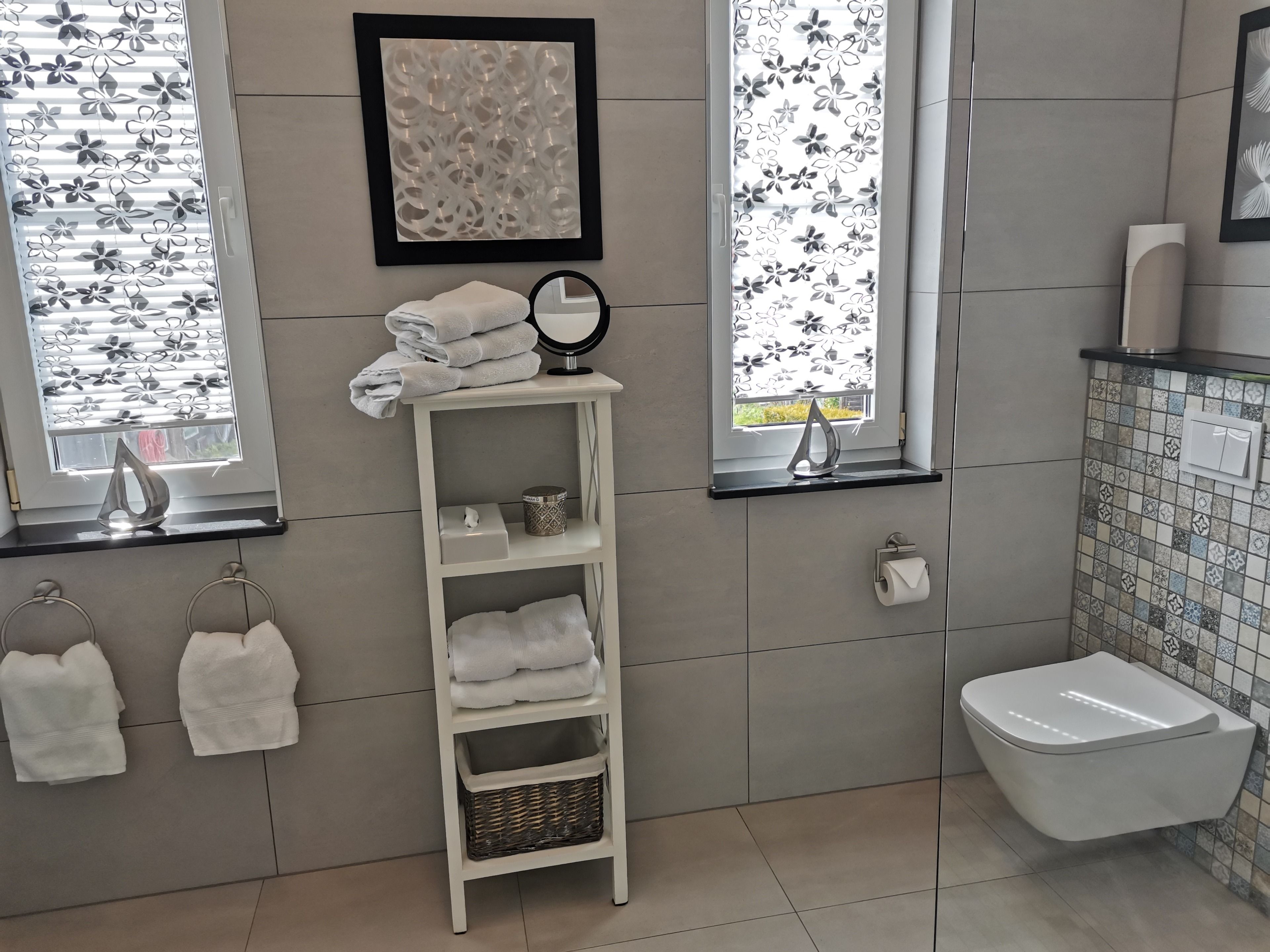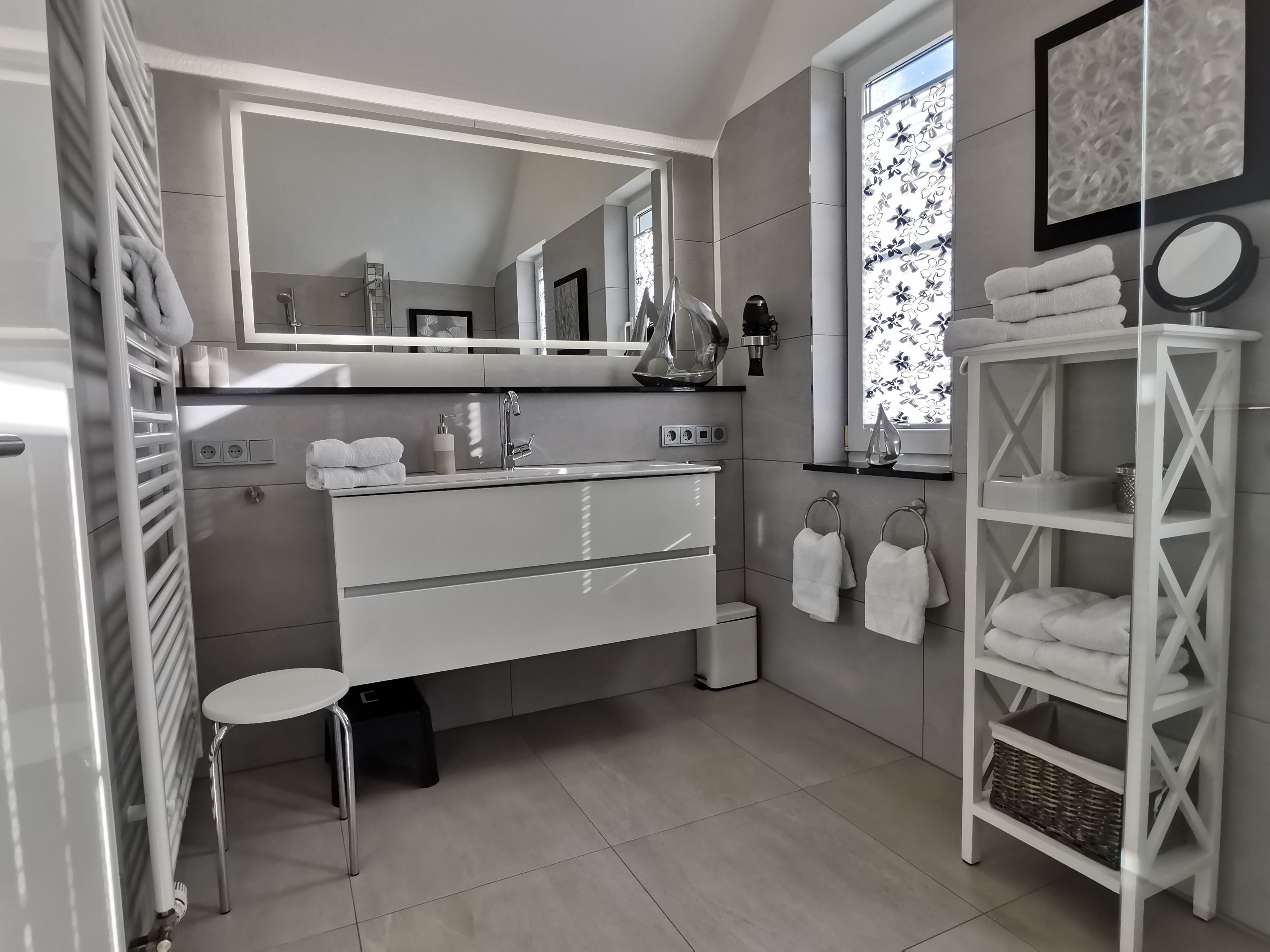 Im komfortablen, giebelhohen Bad finden Sie ein WC, übergroße, ebenerdige Dusche und beleuchteten Panoramaspiegel. Internetradio für einen beschwingten Start in den Tag! Kosmetiktücher, Schminkspiegel, Seifenspender, Fön, Sitzhocker und Toilettenpapier sind vorhanden. Handtuchtrockner mit Fussbodenerwärmung. Für Ihre Badutensilien stehen ausreichend Ablageflächen zur Verfügung.