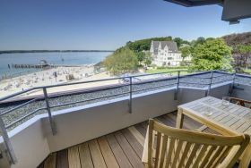 Der überdachte Balkon öffnet sich Richtung Meer und lädt mit seinem außergewöhnlich guten Ausblick zum Erholen und Genießen der frischen Ostseeluft ein.