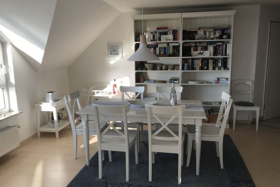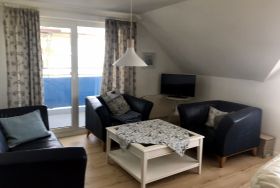 Die im zweiten Obergeschoss an der Nord- und Westseite des Hauses gelegene, durch große Glasfenster freie Blicke auf das Meer bietende, ca. 75 qm große Wohnung Nr. 55 verfügt über Bad/WC mit Dusche, zwei Schlafzimmer sowie einen geräumigen Wohnraum mit Sitzgruppe, Essplatz für bis zu 6 Personen und einer Küchenzeile ( Ceran-Kochfeld mit Backofen, Kühlschrank, Geschirrspüler, Kaffeemaschine, Toaster, Wasserkocher). Der größere Wohnraum sowie das eine Schlafzimmer haben Zugang zum südwestlich gelegenen Balkon und sind oftmals Schauplatz schöner Sonnenuntergänge.