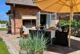Vom Wohnraum haben Sie direkten Zutritt in den mit Friesenwällen herrlich angelegten Garten, wo Sie ausgewählte Gartenmöbel zu einem genüsslichen Kaffeeplausch erwarten. Ihr Auto hat natürlich einen überdachten Parkplatz (A), kostenfrei.