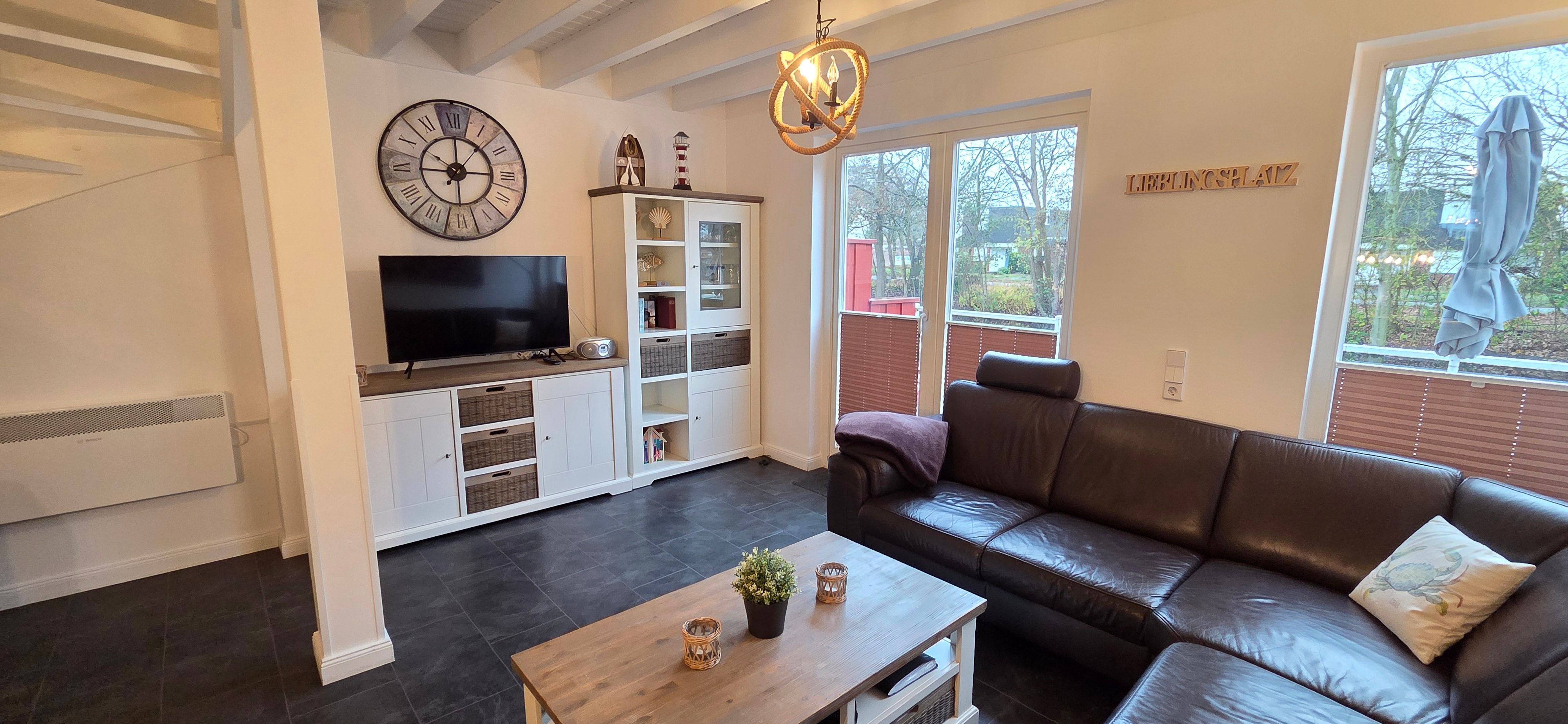 Die komfortable Ausstattung lässt keine Wünsche offen: drei Schlafzimmer mit Doppel-Boxspringbetten, zwei Schlafcouchs (120x200cm) im Wohnbereich und auf der Empore, ein Bad (mit Dusche, Dusch-Badewanne und Sauna), ein Gäste-WC sowie eine voll ausgestattete offene Küche. Neben gemütlichen Sitzgelegenheiten für 8 Personen ist auch ein Kamin vorhanden. Für Familien mit kleinen Kindern stehen Babybett, Hochstuhl, Treppenschutzgitter und gesicherte Steckdosen bereit.