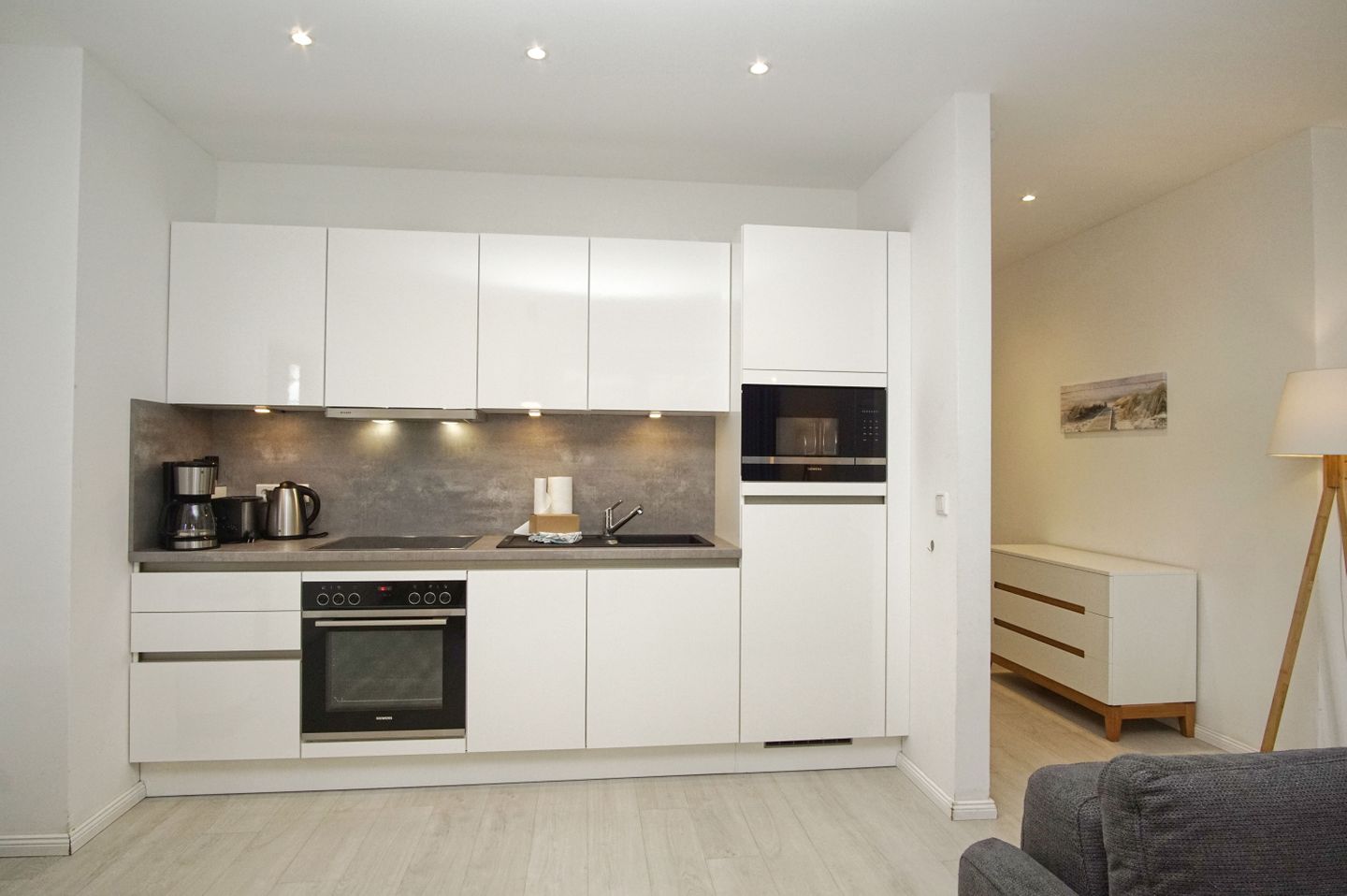 KÜCHE // Küchenzeile, Ceranherd, Spülmaschine, Kühlschrank mit Gefrierfach, Mikrowelle, Toaster, Wasserkocher, Kaffeemaschine, reichlich Besteck, Geschirr und Küchenutensilien ++