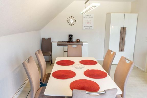 Die Küche ist geschlossen und mit einem Esstisch sowie einer umfassenden Ausstattung versehen. Hier stehen Ihnen Ceranherd, Backofen, Kühlschrank mit Gefrierfach, Mikrowelle, Spülmaschine, Kaffeemaschine und viele weitere Küchengeräte wie Mixer, Wasserkocher, Eierkocher und Toaster zur Verfügung. Sämtliche Küchenutensilien, Geschirr, Besteck sowie Geschirrhandtücher sind in der Erstausstattung enthalten.