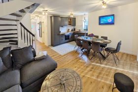 Im hellen Wohnbereich mit Smart-TV erwartet Sie eine offene, voll ausgestattete Küche samt Essbereich. Neben Filter-Kaffeemaschine, Toaster, Wasserkocher, Eierkocher, Handmixer, Backofen und Geschirrspüler, steht Ihnen auch ein großer Kühlschrank mit Tiefkühlfach zur Verfügung. Für die kleinen Gäste gibt es Kinderbett, Hochstuhl, kindgerechtes Besteck und Spielzeug.